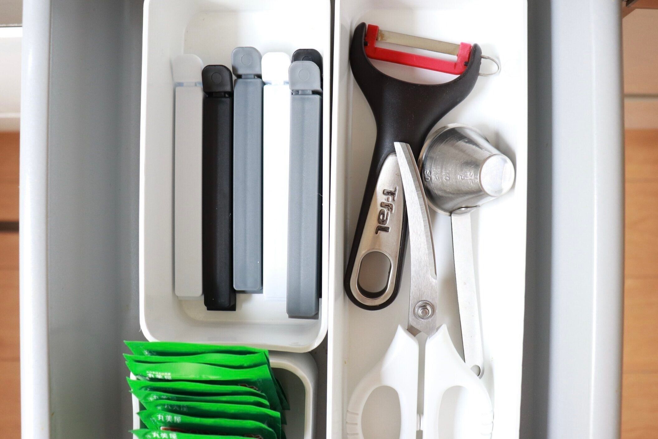 キャンドゥには密封クリップもモノトーン商品あり!黒、グレー、白が各2本ずつ入っていて110円です。引き出しの中も色味を減らすことによりスッキリ効果が。