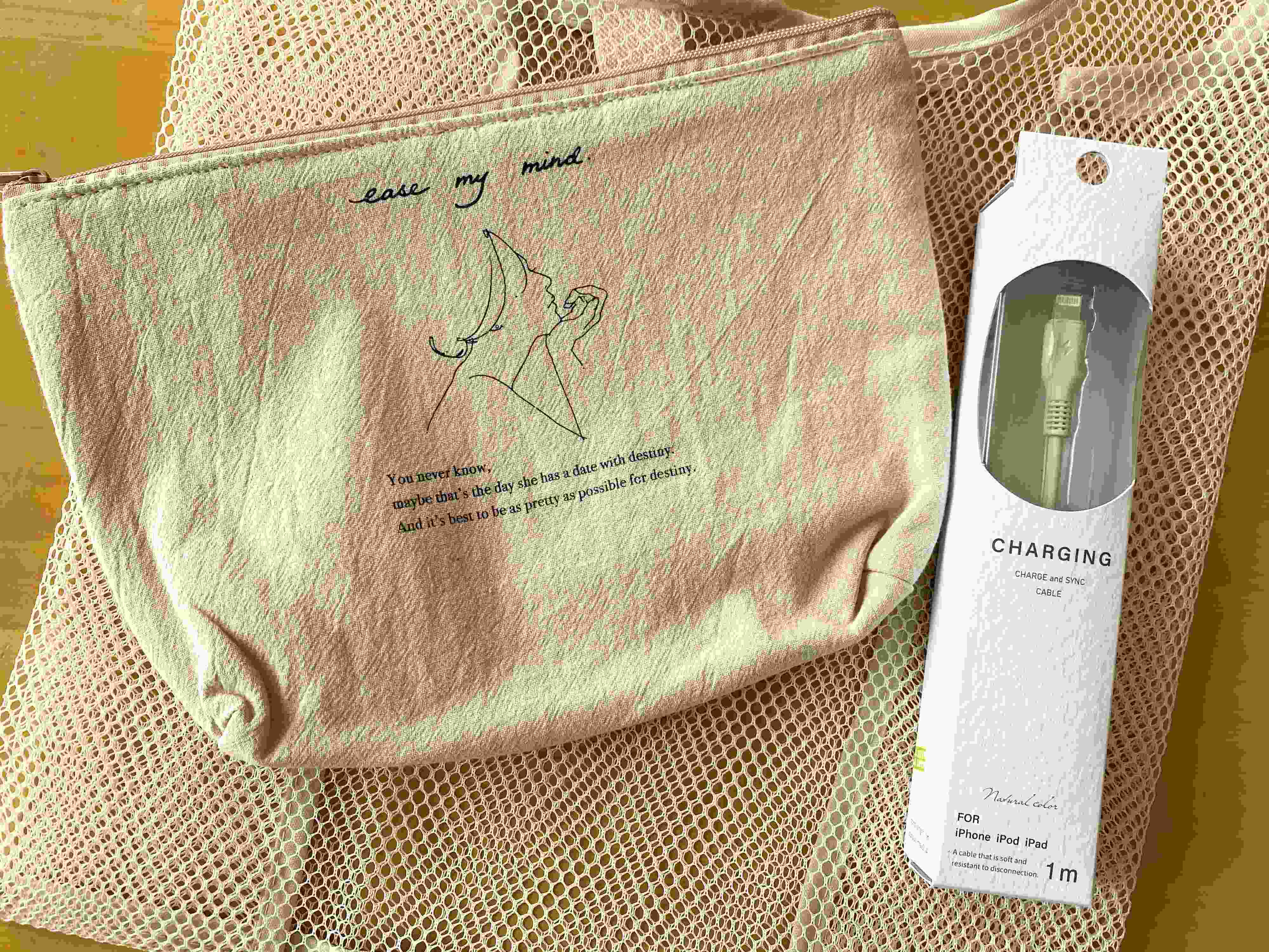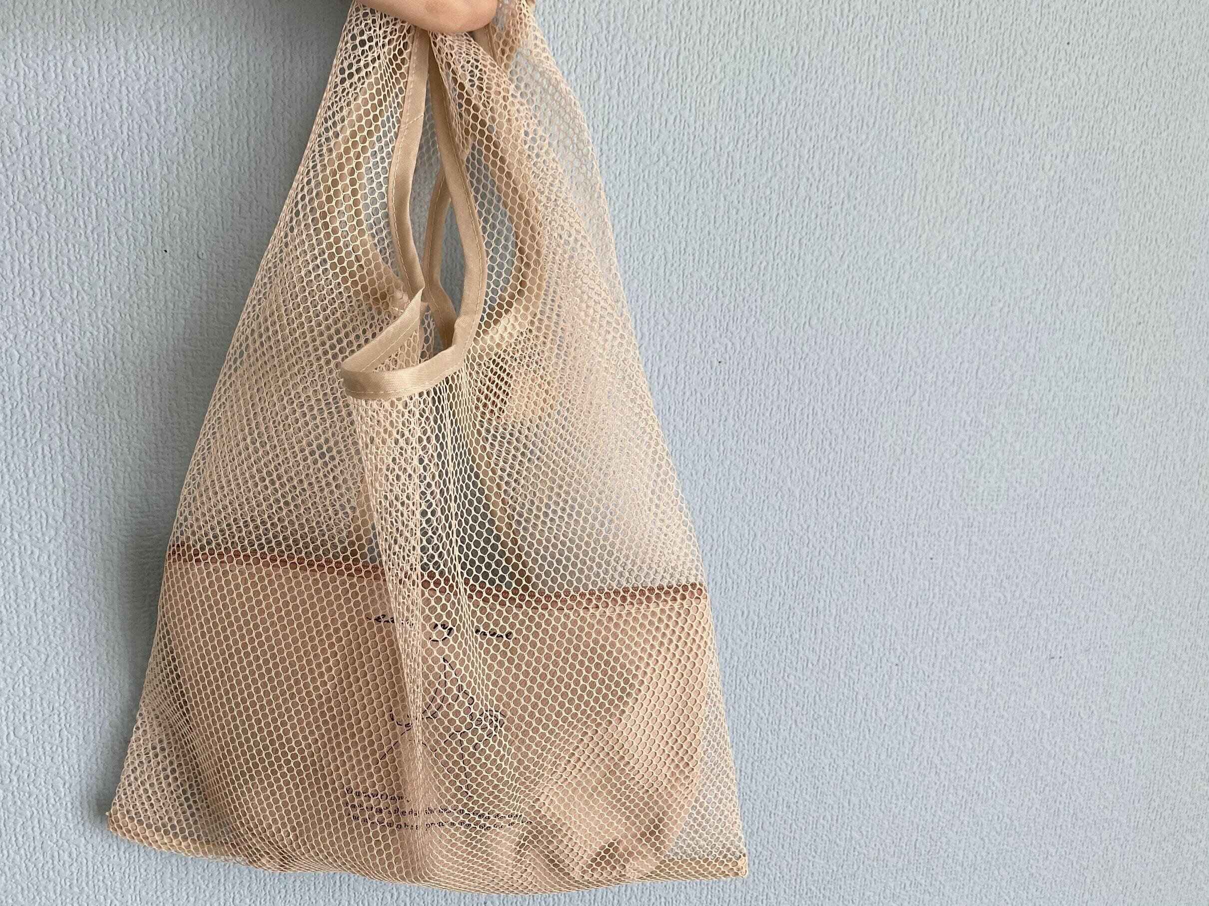 さらに、同じくすみカラーのメッシュエコバッグのインナーポーチにしてみました。カラーリングがそろうとオシャレで持ち歩きも問題なし!