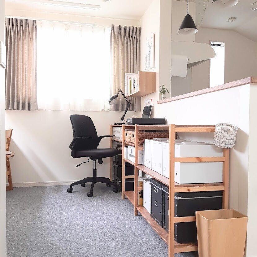 わが家は棚板を抜いてワークススペースをつくっています。書類も同じく無印のファイルボックス収納にしてパイン材ユニットシェルフに収めています。モジュールが合うので見た目のスッキリ感も叶います。何と言ってもリーズナブルなのがうれしいポイント。