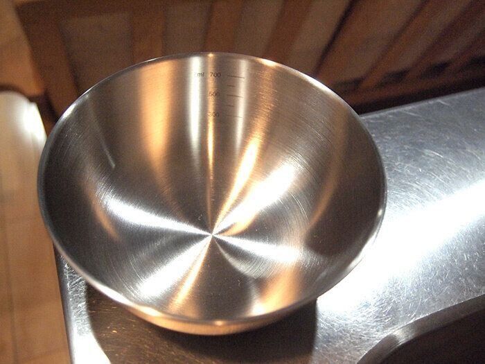 ステンレスのボールです。ml単位の目盛りがついており、簡単な軽量にも使えます。お値段は490円。少なめの和え物などを使うときに便利ですよ。たかがボール、されどボール、ステンレスのしっかりした製品でこの価格というのが魅力です。