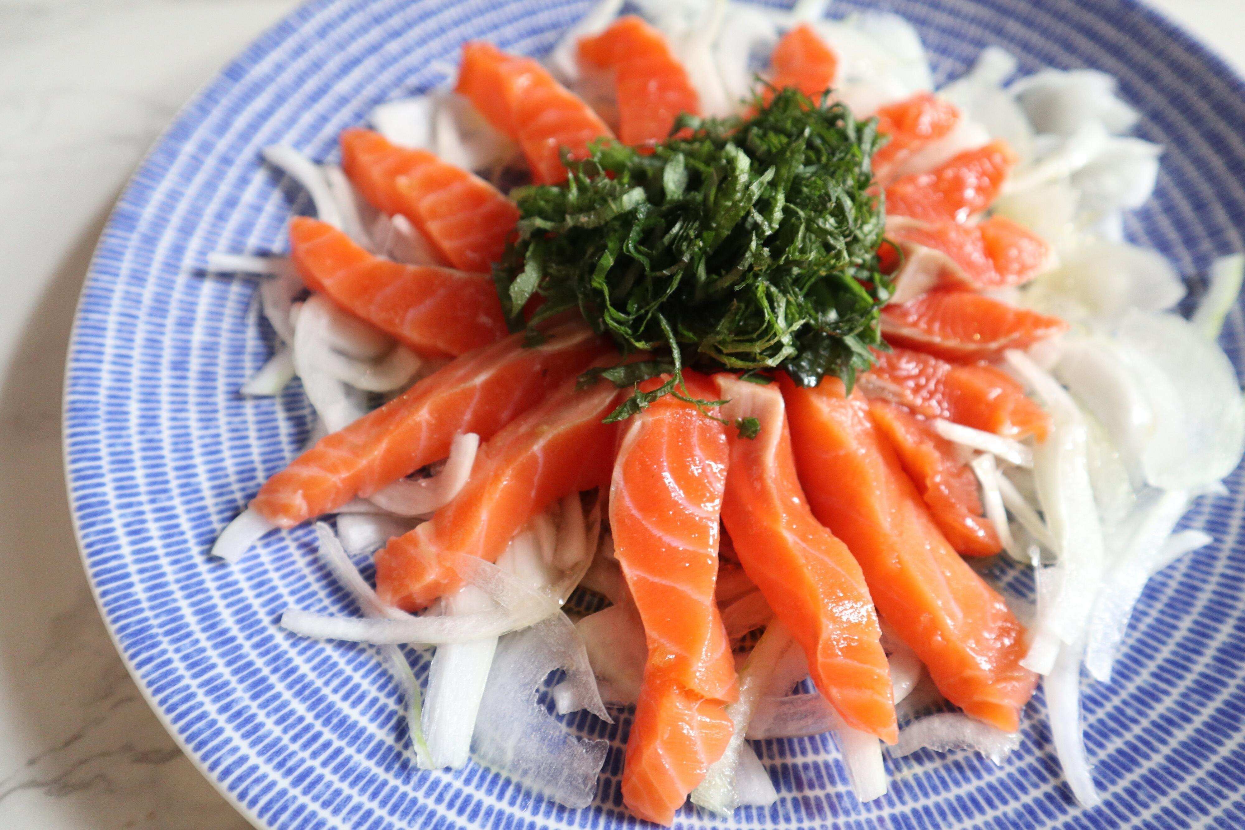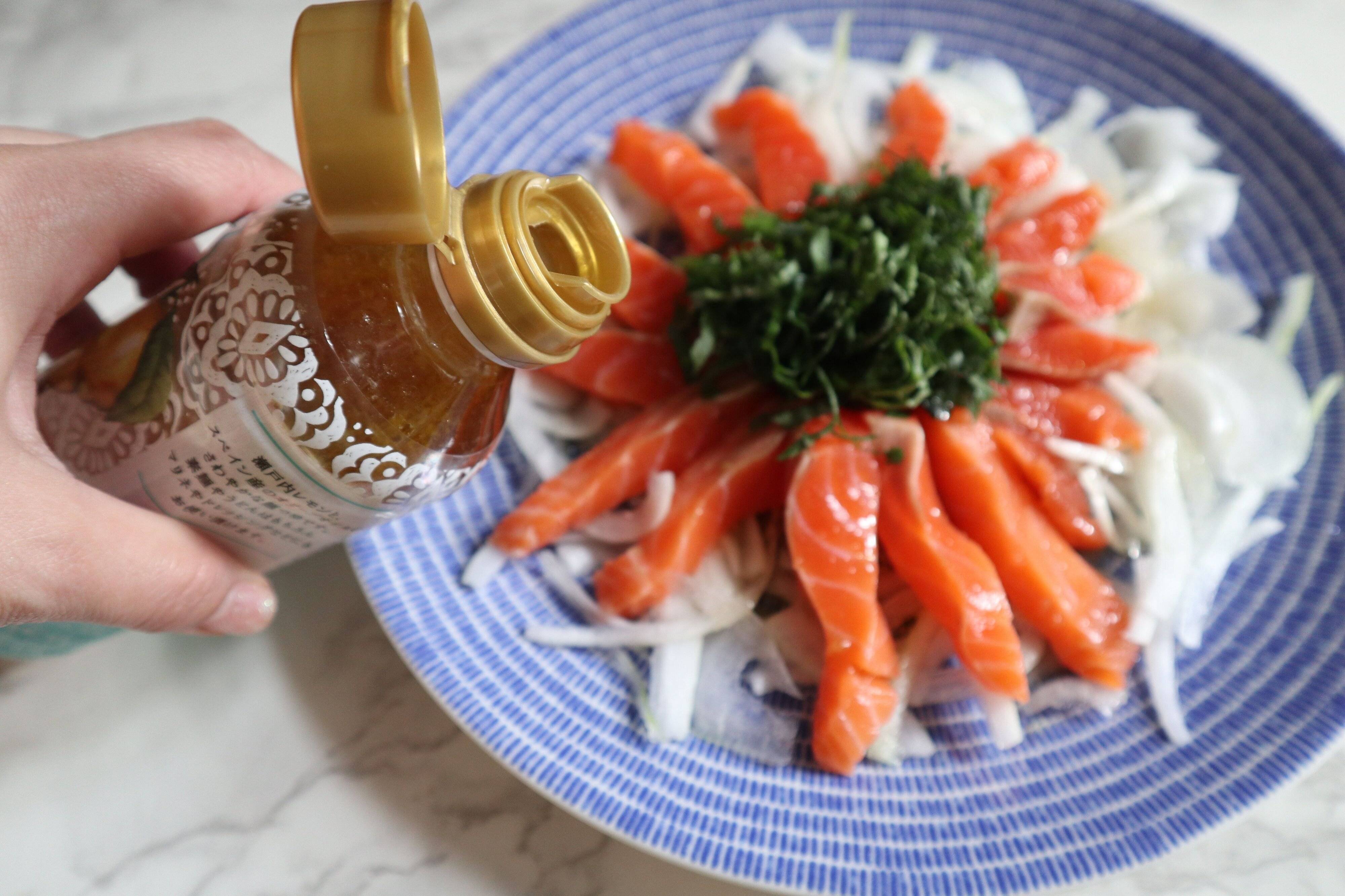 器に玉ねぎ(薄切りにして水にさらして水けを切る)、サーモン、大葉を盛りつけたら、瀬戸内レモンオリーブオイルつゆをまわしかけたら完成です。