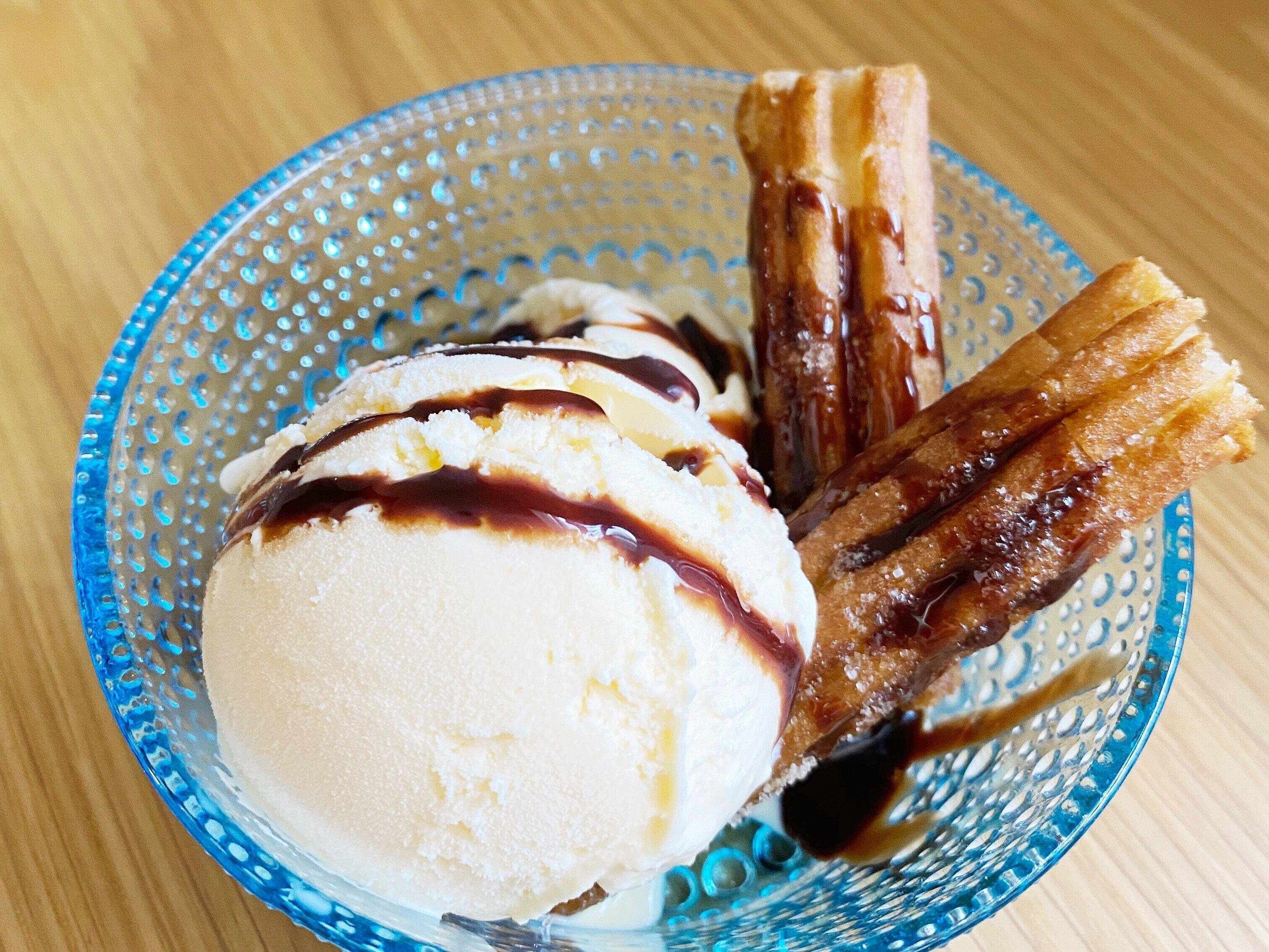 焼きたての温かいチュロスをバニラアイスに添えて食べるのもオススメ。