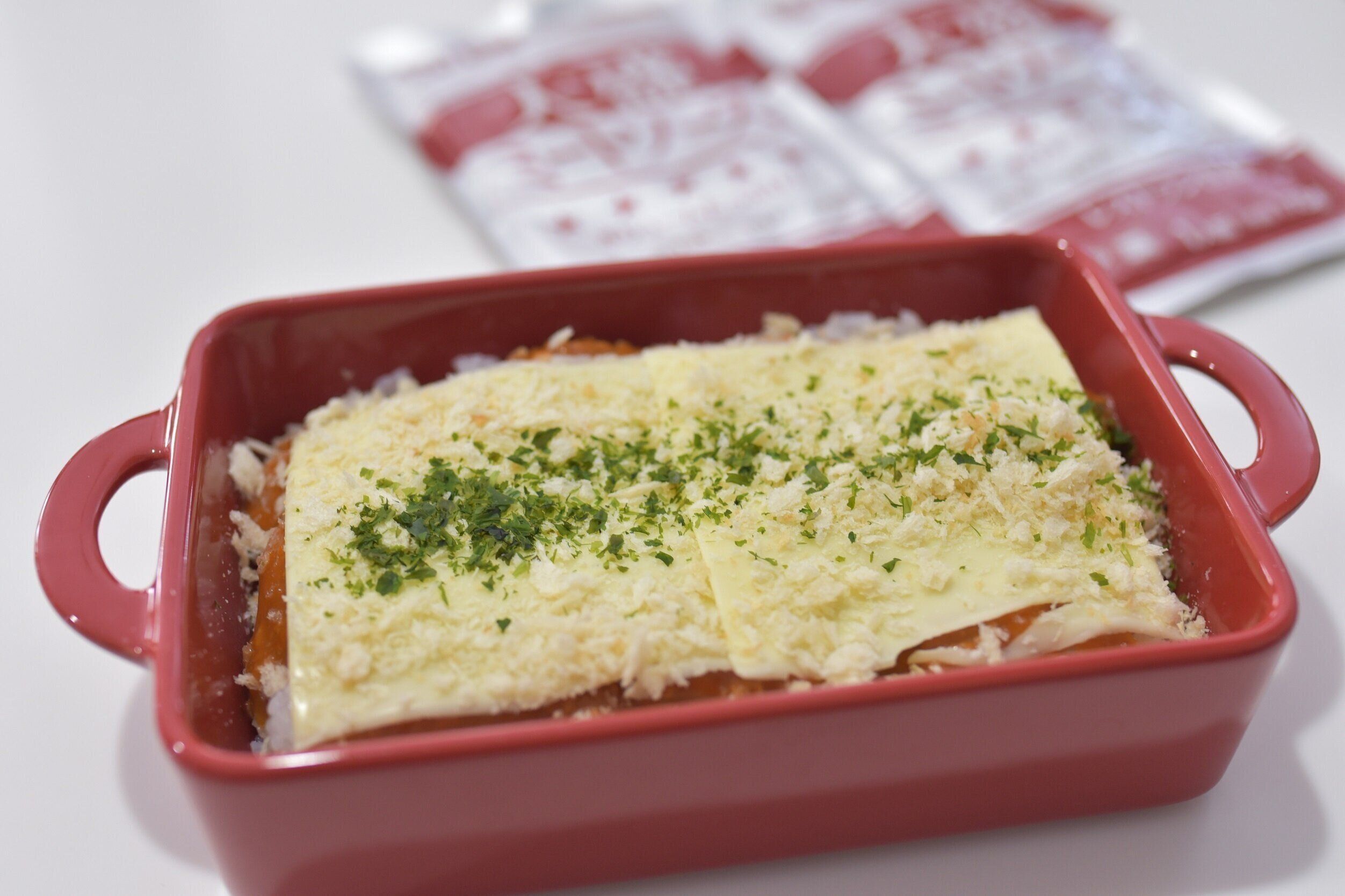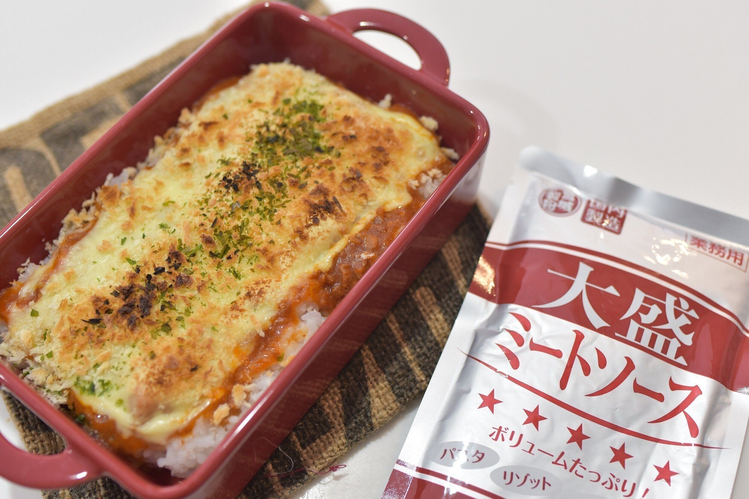 トースターで焦げ目をつけたら完成です。パン粉のサクサク感、チーズとミートソースの濃厚な味わいが、ごはんにとてもよく合います。