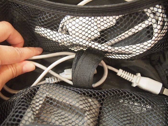 中央部分には長めのコードも収納できるように、コードを束ねるテープ(マジックテープつき)が搭載されており、PC用の長めでかさばるコードもいけそうだなという感触です。マチの大きさもそこそこあり、厚めのガジェットを入れてもきちんと締まるところが優秀。