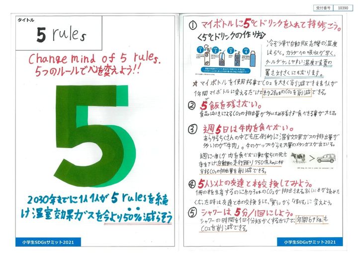 山田遥斗さんは、CO2を減らすために、誰もが日常の中で、今すぐにでも始められるルールを提案。「5」という数字に着目したのは、多すぎず少なすぎない、ちょうどいい数であり、心がけや習慣を変えるのにも、ムリなく実践できて続けられる数だから。
