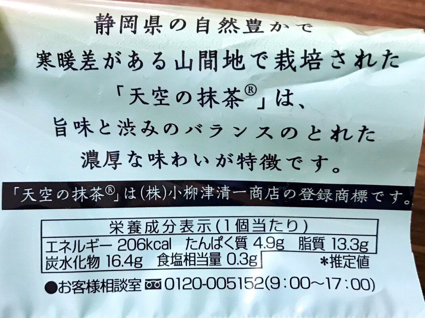 抹茶色のカラーが渋めのパッケージ。向かって右に、静岡県産「天空の抹茶(R)」使用と記載されています。