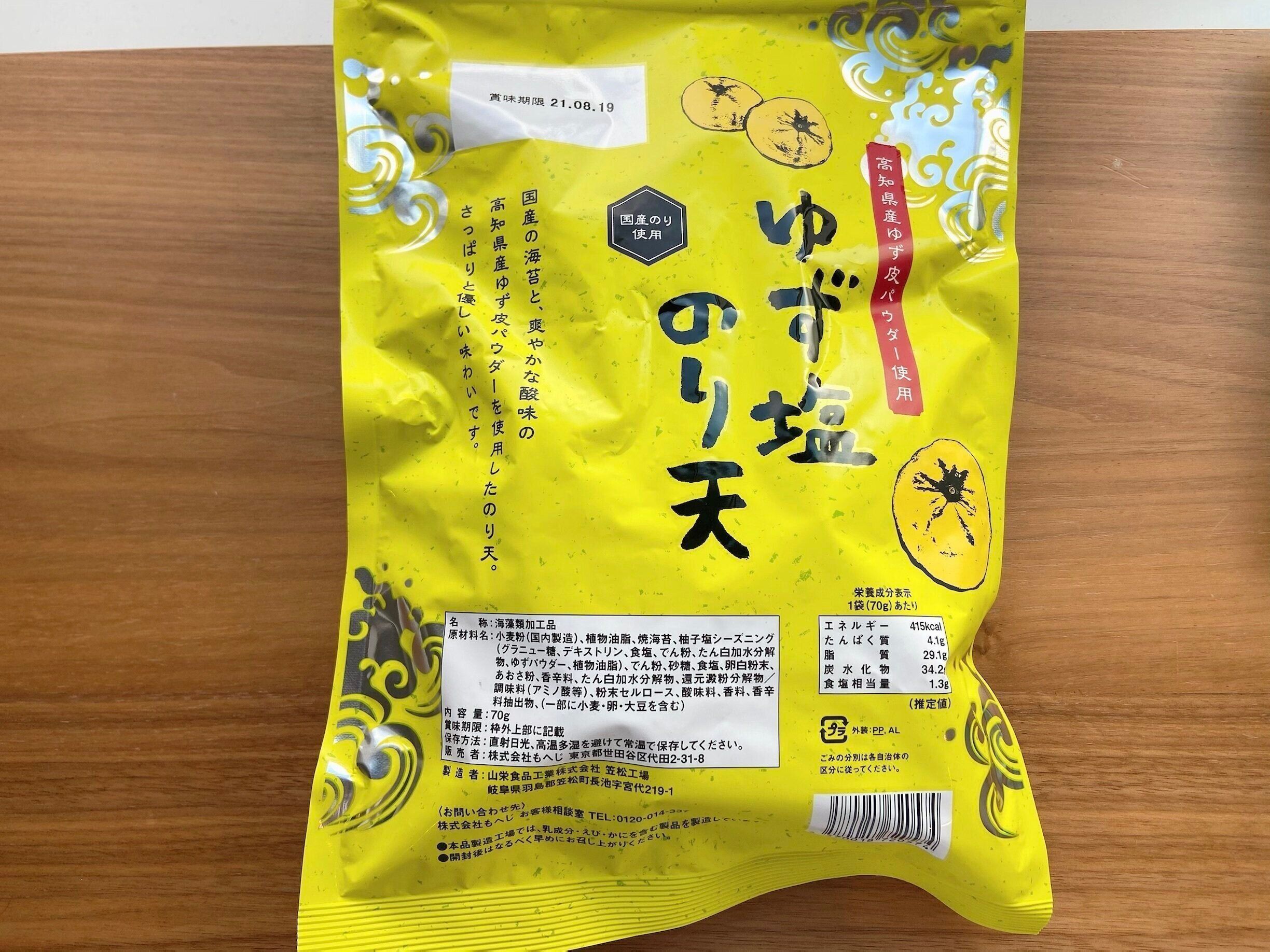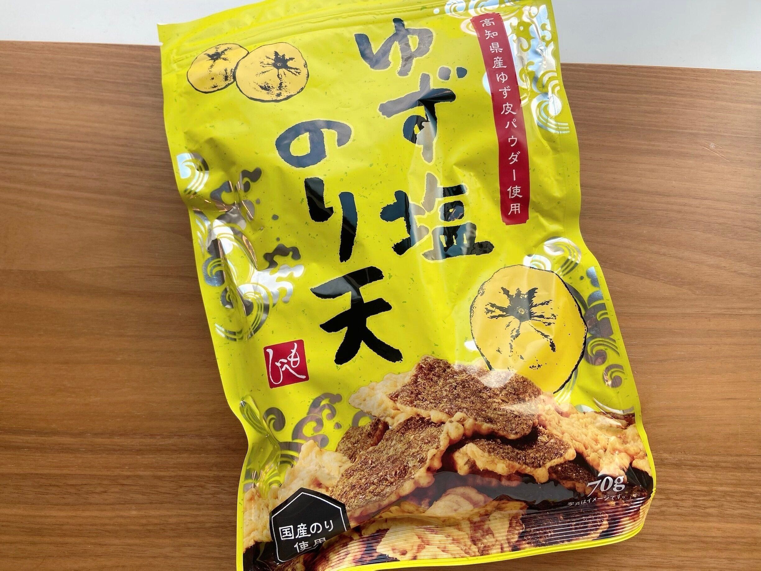 ゆずのいい香りと、のりの風味もしっかりと感じられる、食べだしたら止まらない系のお菓子「ゆず塩のり天」です。