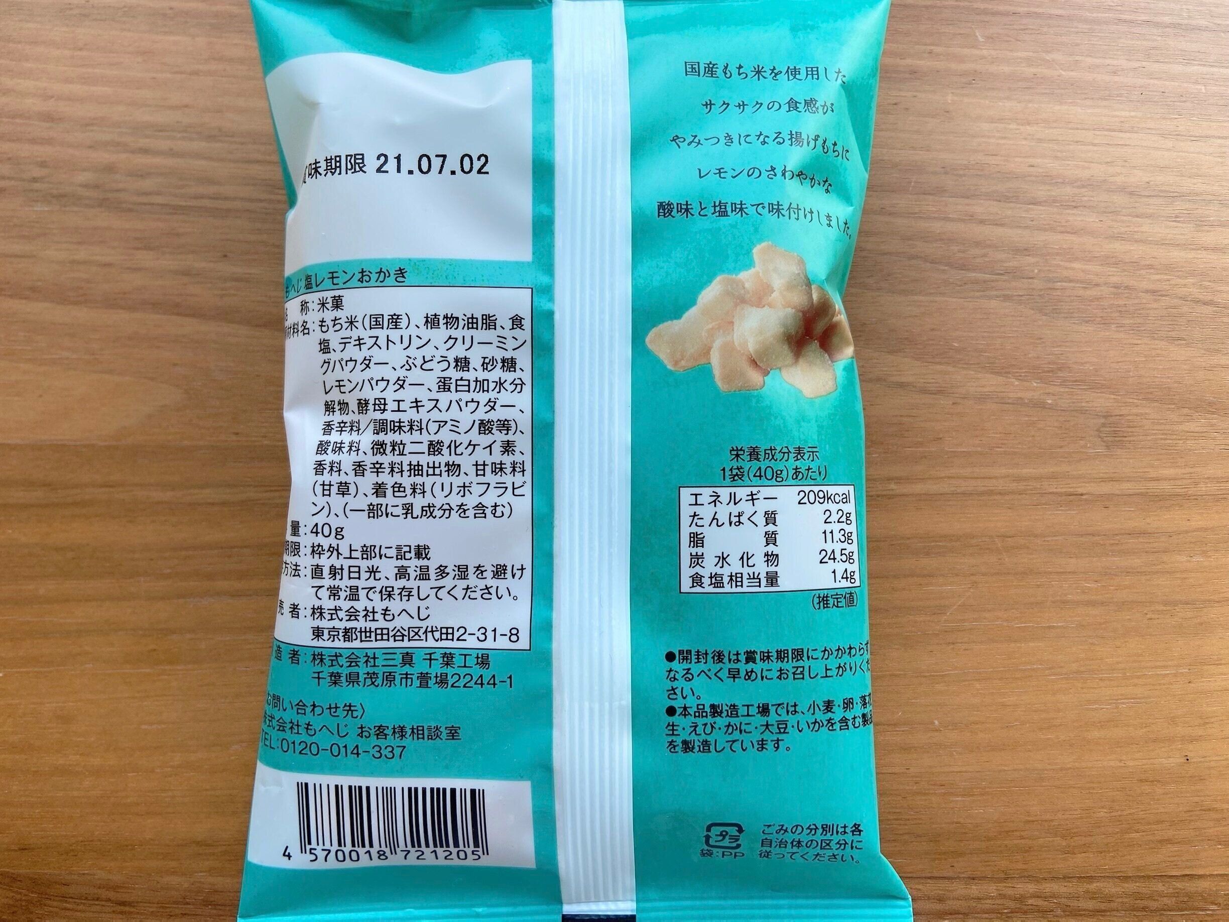 レモンの酸味がほんのりして、でも、このほんのりとした酸味がクセになる「塩レモンおかき」。