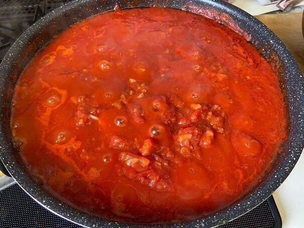 大き目の鍋にオリーブオイル、にんにくを軽く炒めてトマト缶を全て入れてトマトソースを作り、小分け保存。すぐ使う分は冷蔵庫へ。残りは冷凍庫へ。