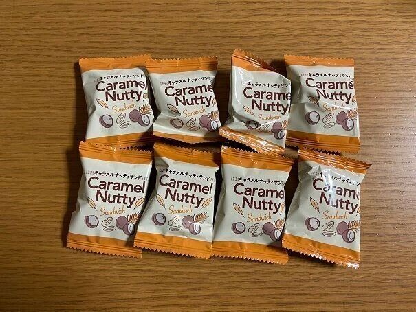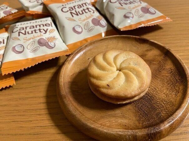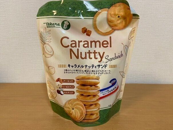 アーモンド・ヘーゼルナッツ・ココナッツを練り混ぜたクッキーに、キャラメルナッティクリームがサンドされた「キャラメルナッティ」(購入時価格:198円)がとっても美味しくておすすめ!