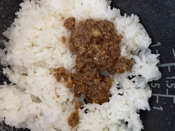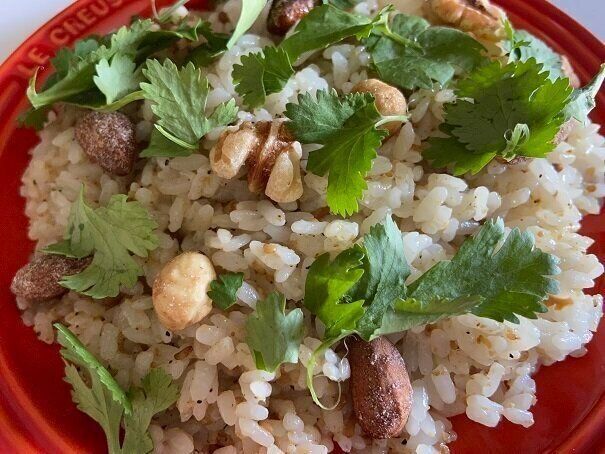 カルディのデュカ風ナッツライスの素は、炊きたてご飯に混ぜるだけで簡単にできちゃいます。混ぜている時からいい香り♪