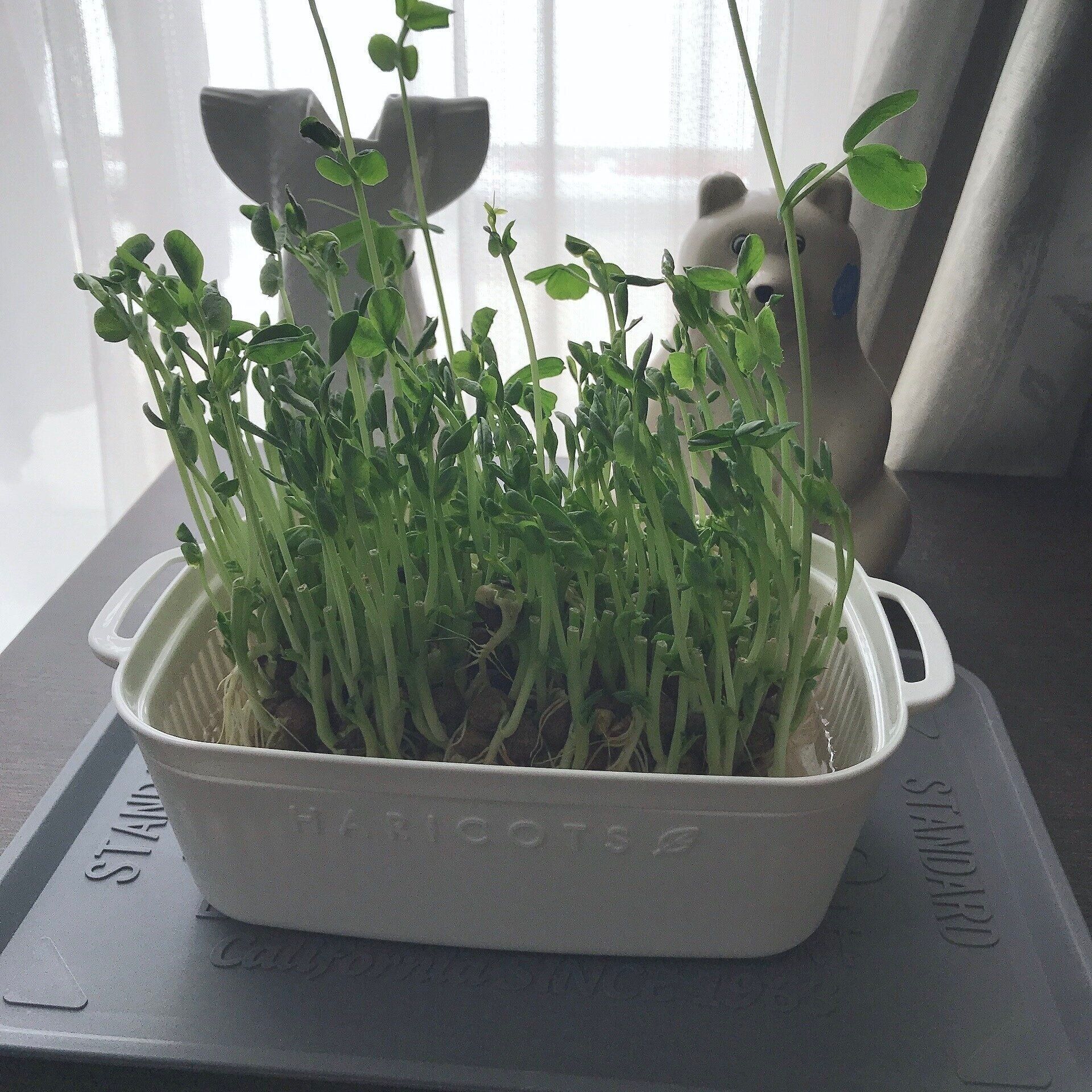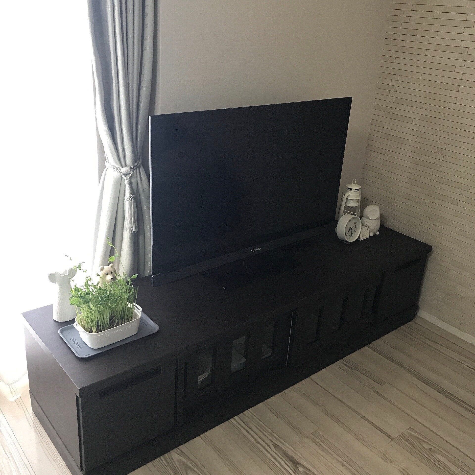 リビングにあるテレビボードの上に置いて育てていましたが、豆苗を育てていても生活感があまり出ず、豆苗のグリーンがなんだかちょっといい感じに見えませんか?