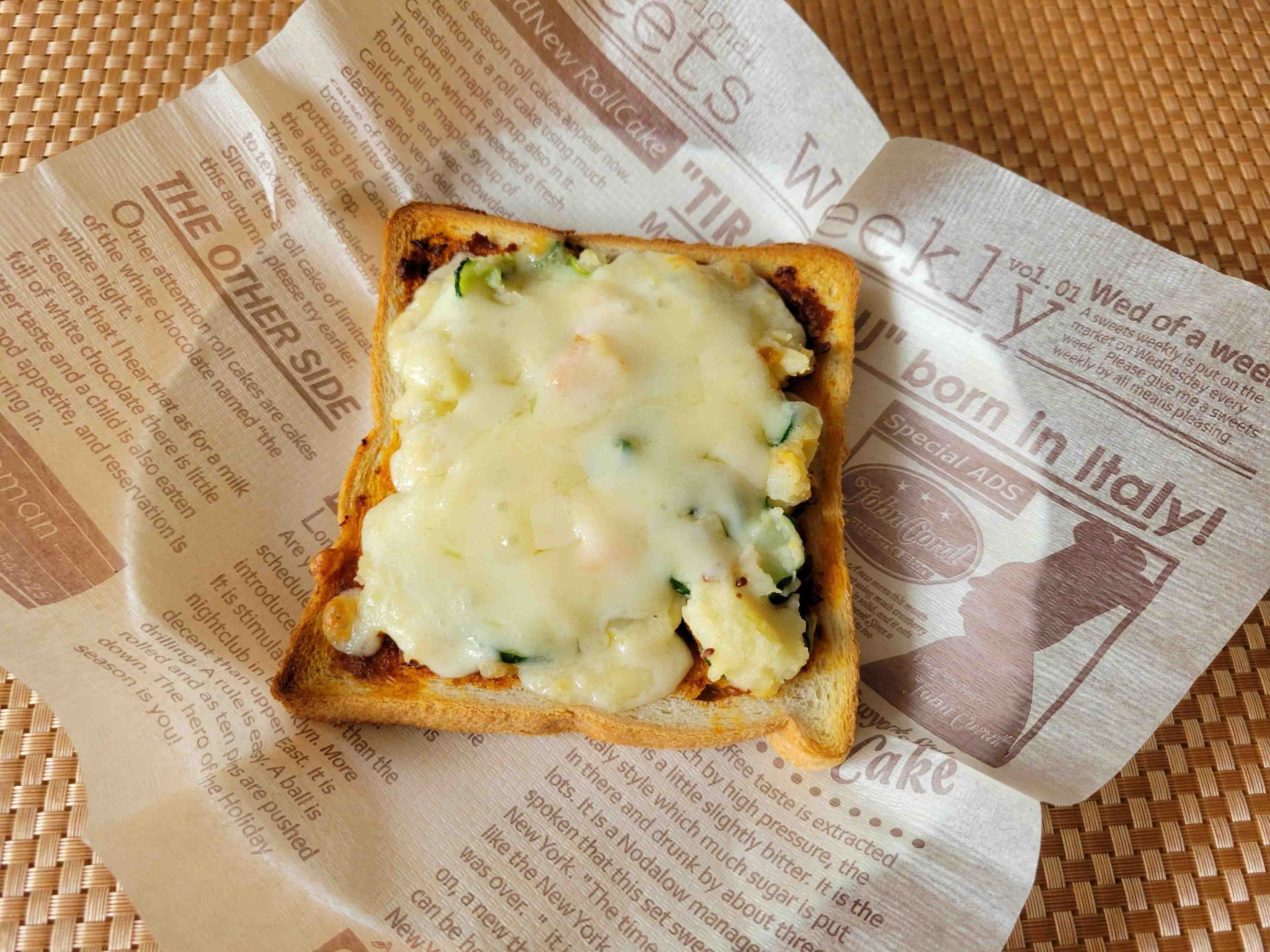 こちらは、食パンに食べるガラムマサラを塗ってポテトサラダとチーズをのせてトーストしたもので、朝食や補食にピッタリ。食べるガラムマサラ+チーズも相性抜群です。