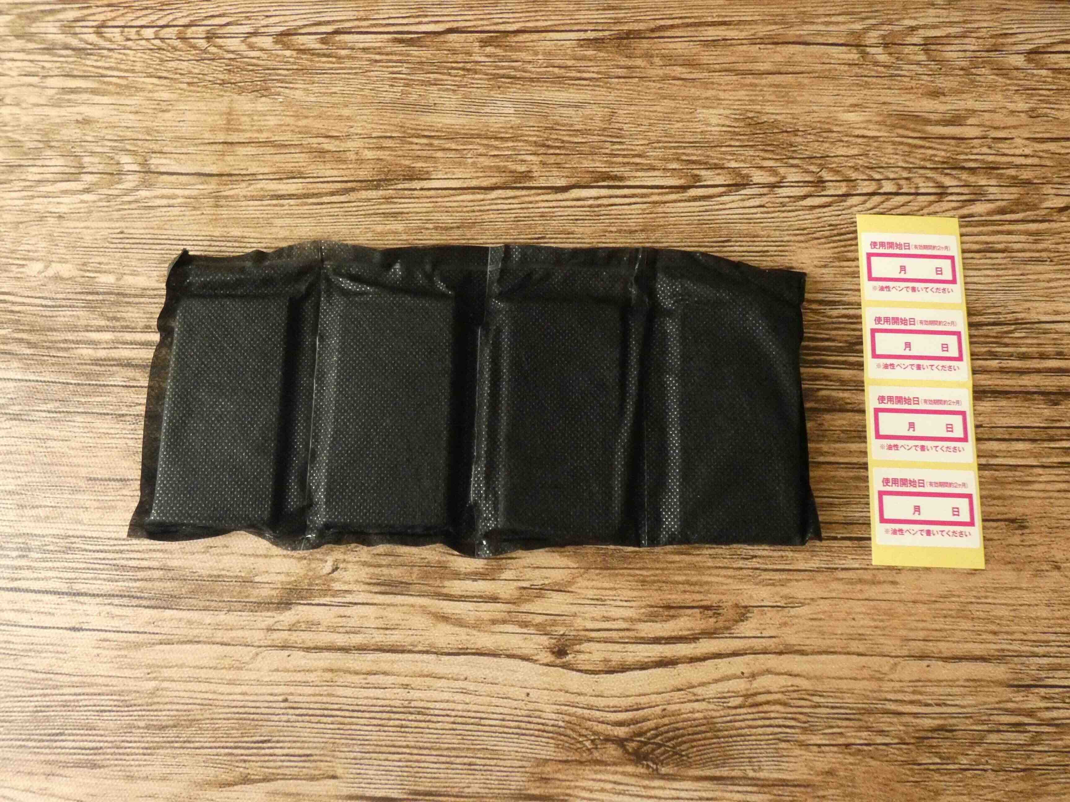 開けてみると黒色のシート4つと有効期限シールが入っていて、シートは分割して使うことが出来ます。黒色はダニが好む色なんだそう。