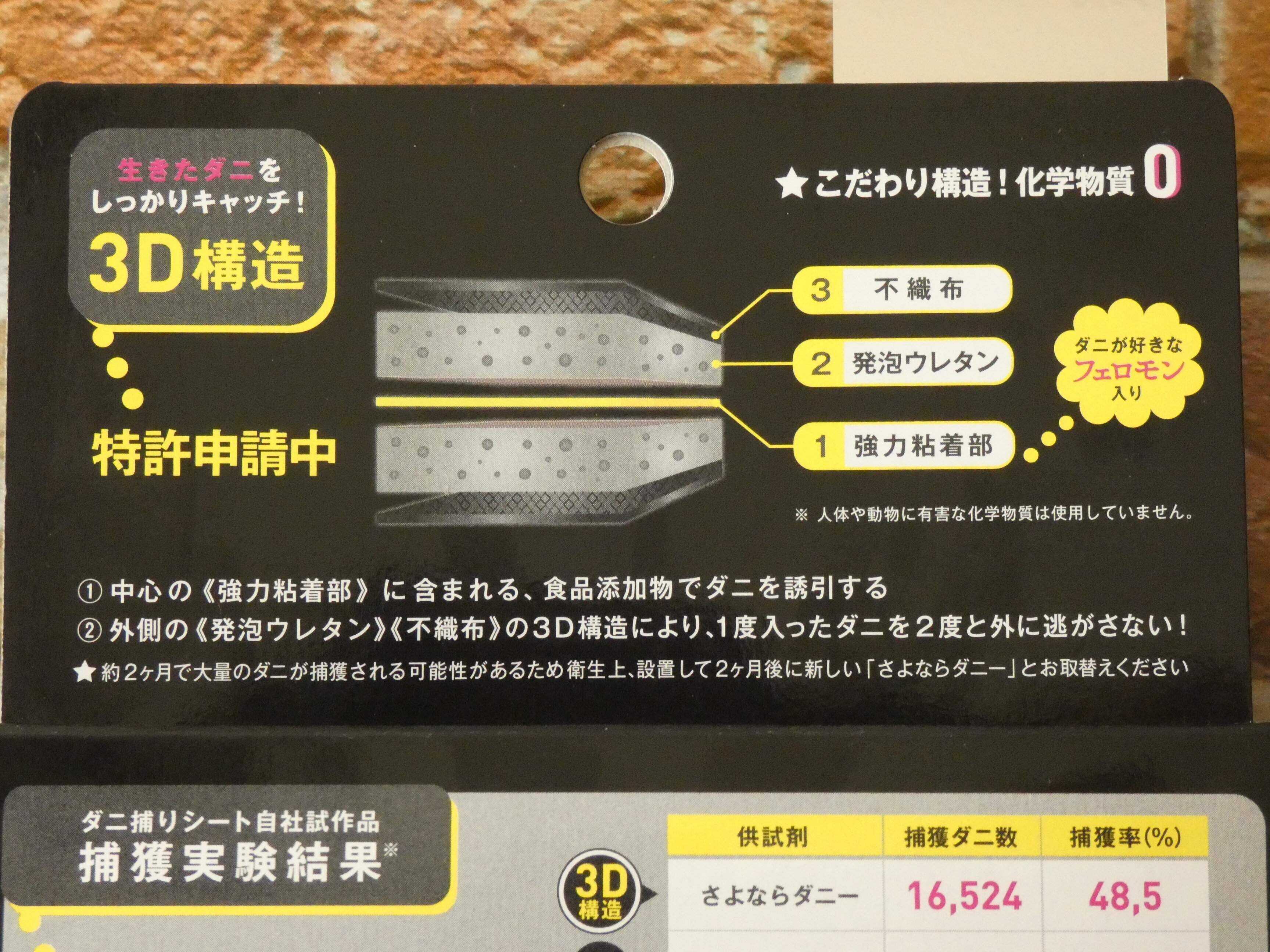 置いておくだけでダニ退治が出来て便利。2ヶ月経ったらそのままゴミ箱に捨てればいいので手軽でオススメ。是非お試しください。