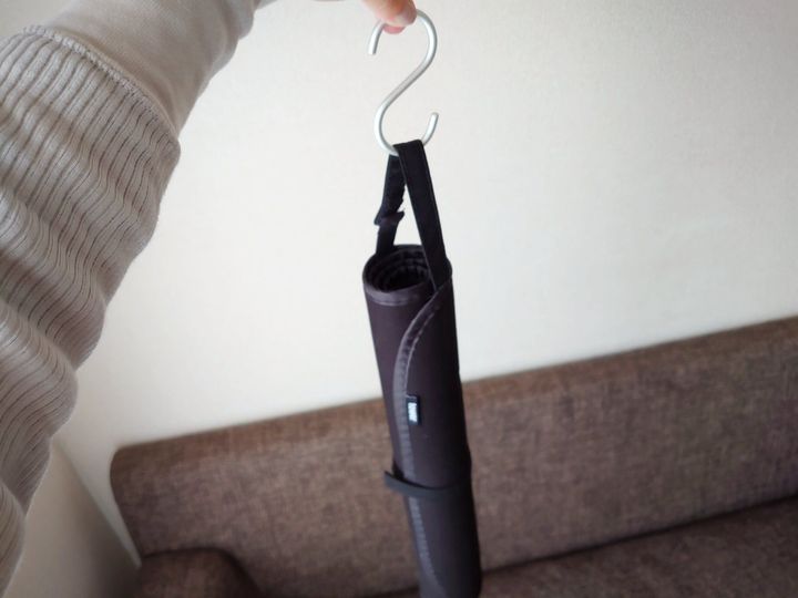 持ち手に付いている面ファスナーを外して吊るせるタイプ。私はS字フックを使って吊るして収納しています。コンパクトなので全く場所をとりません。アイロンをかける場所からなるべく近くに収納することでさらに家事楽、オススメです。