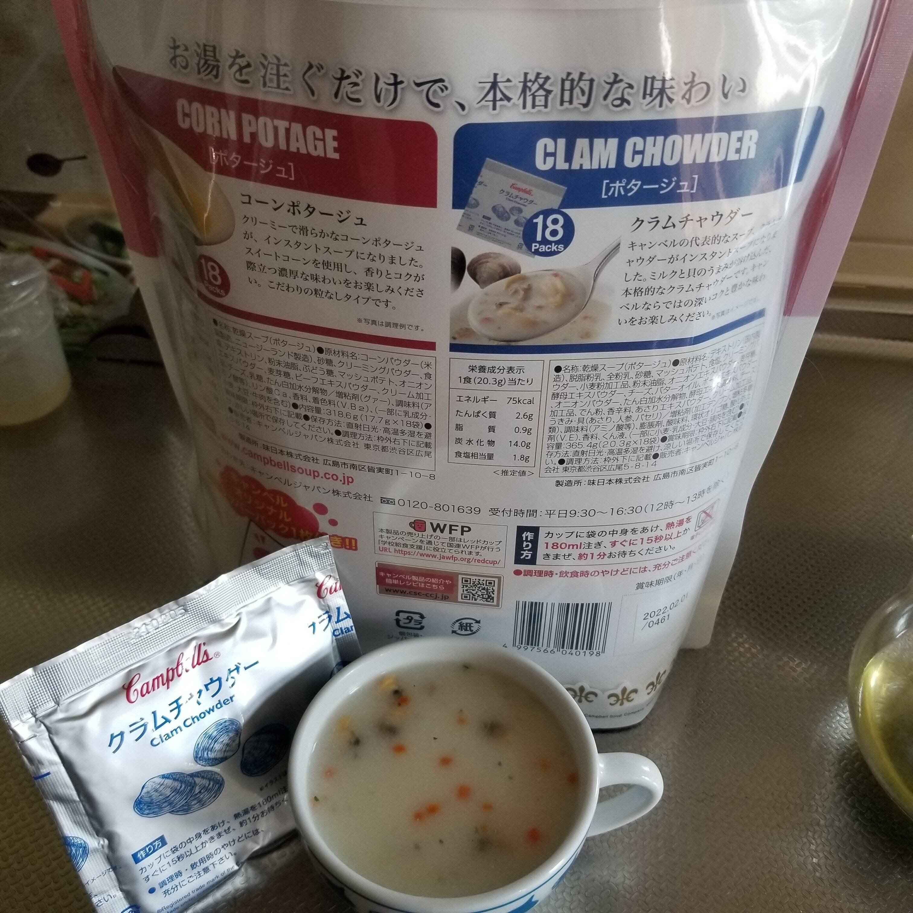 つくってみると、お湯なのに味がとても濃厚です。とくにクラムチャウダーは貝の味がとても濃く出ています。しっかり混ぜないと、底に粉がたまってしまうので少し注意が必要です。