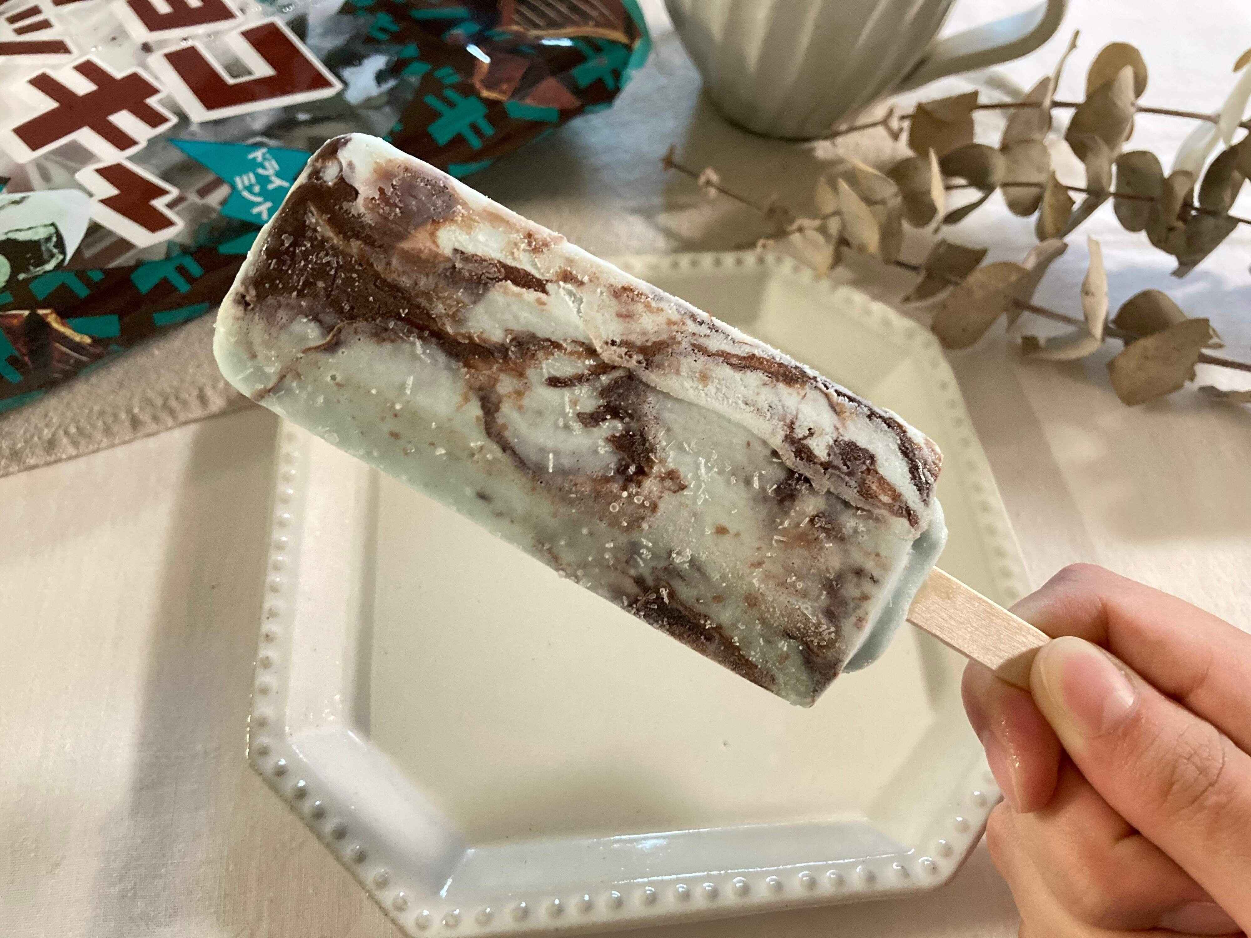 アイスの中のチョコは、パリッと、パキッと、ゴリッと、ゴロッと……ひとつひとつ表情が違うため、食べるたびに変化するチョコの食感が楽しめますよ。チョコとミントの組み合わせのアイスは最高ですね。
