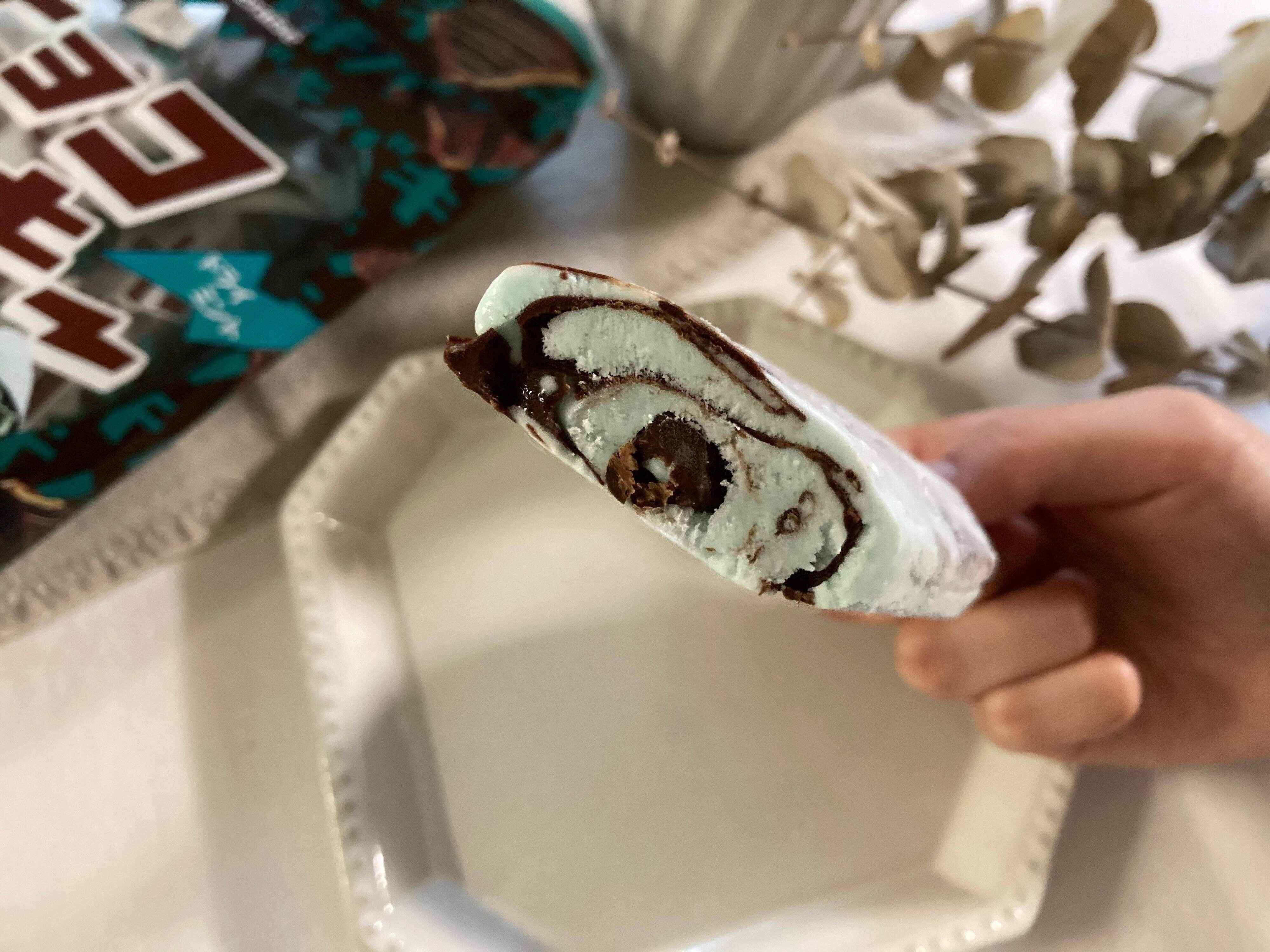 では、「チョコバッキー ドライミント」を食べてみた感想をお伝えします。チョコバッキー・ドライミントは、フランス産ミントリキュールを使用したミントアイスの中に、パリッと食感のスイートチョコが折り重なるように入っています。