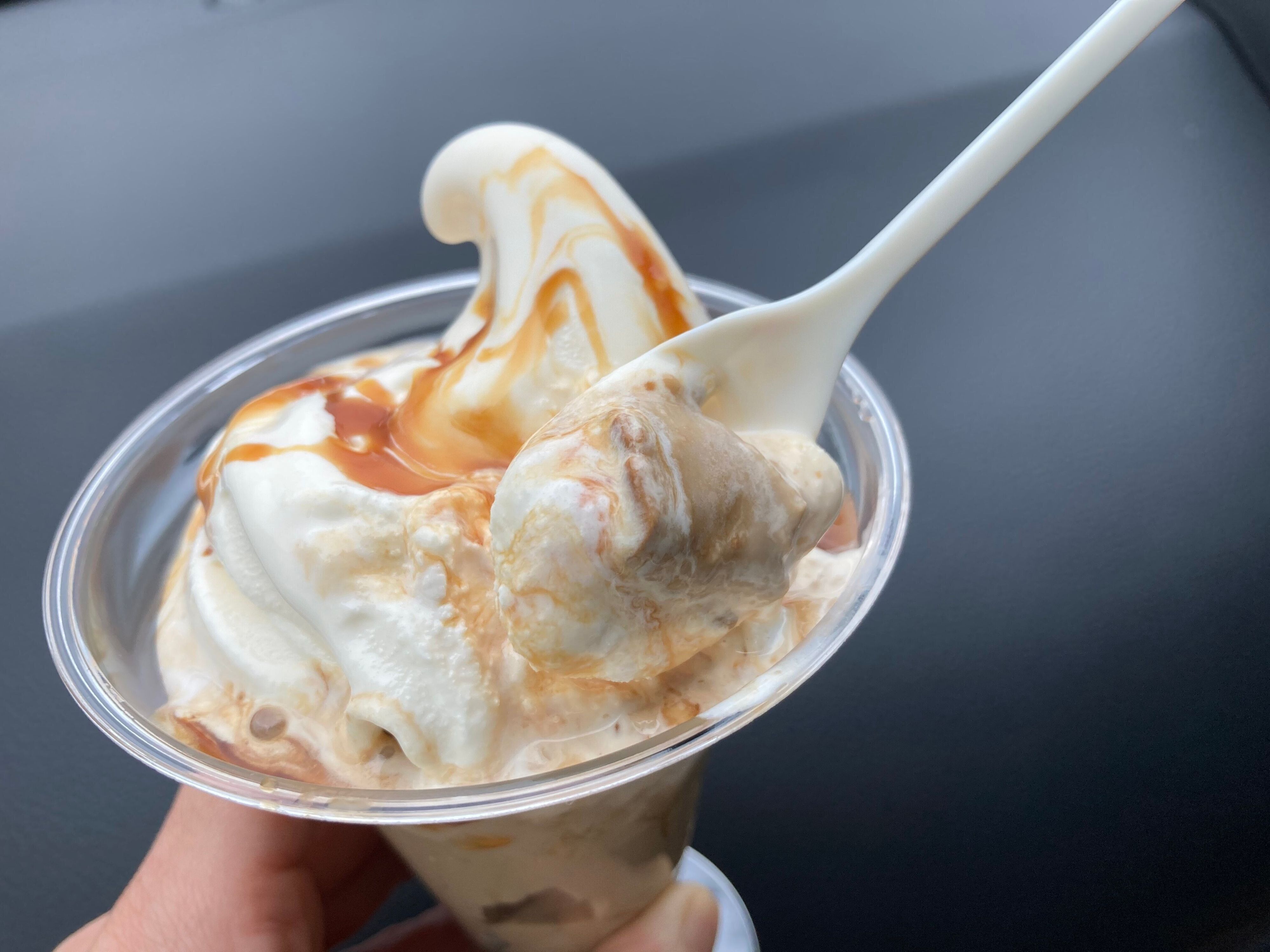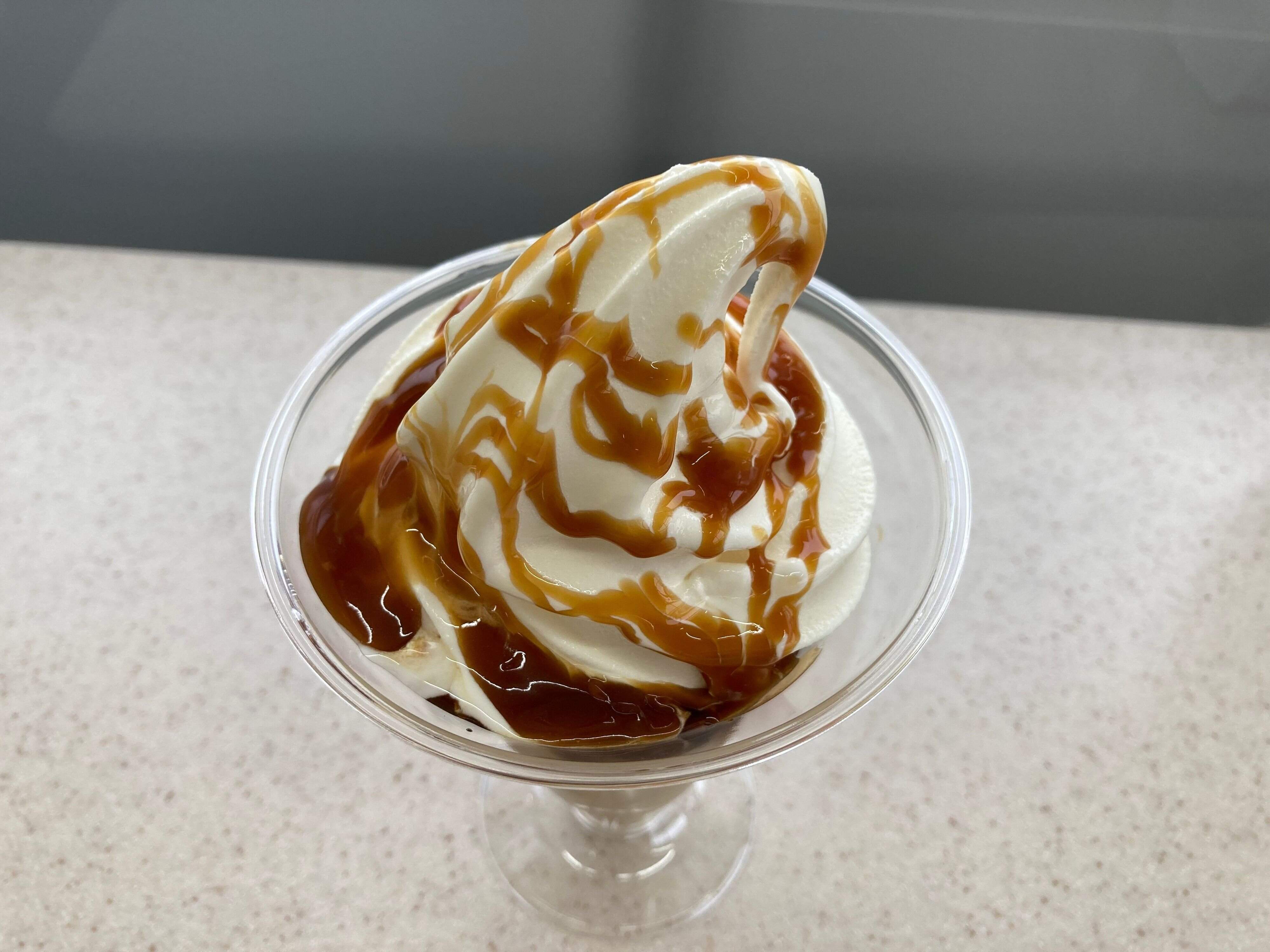 風味豊かなコーヒーソースが絡まり、プリン部分の上にはミニストップの定番のソフトクリームがたっぷりと乗っていて、キャラメルソースがトッピングされています。