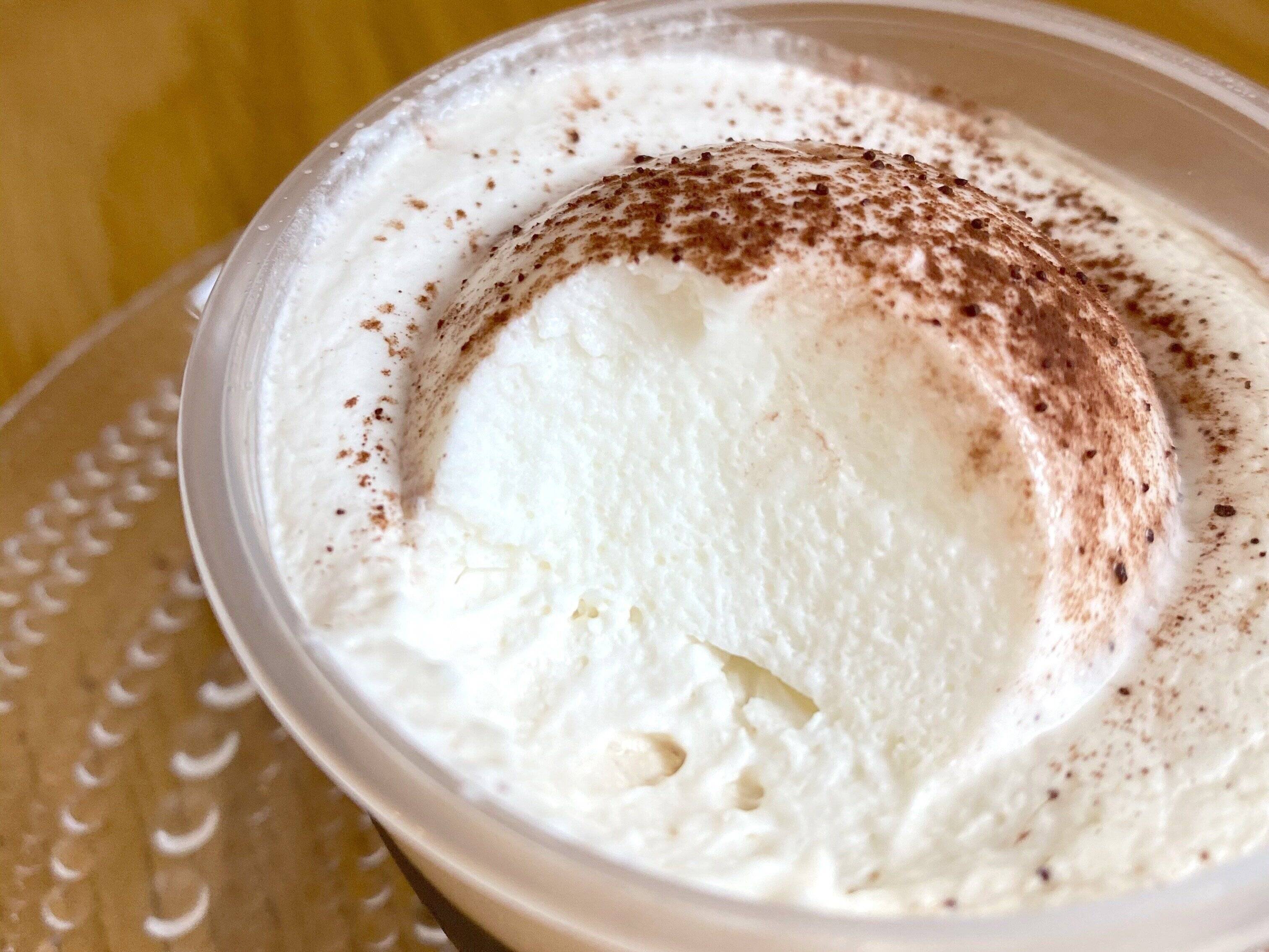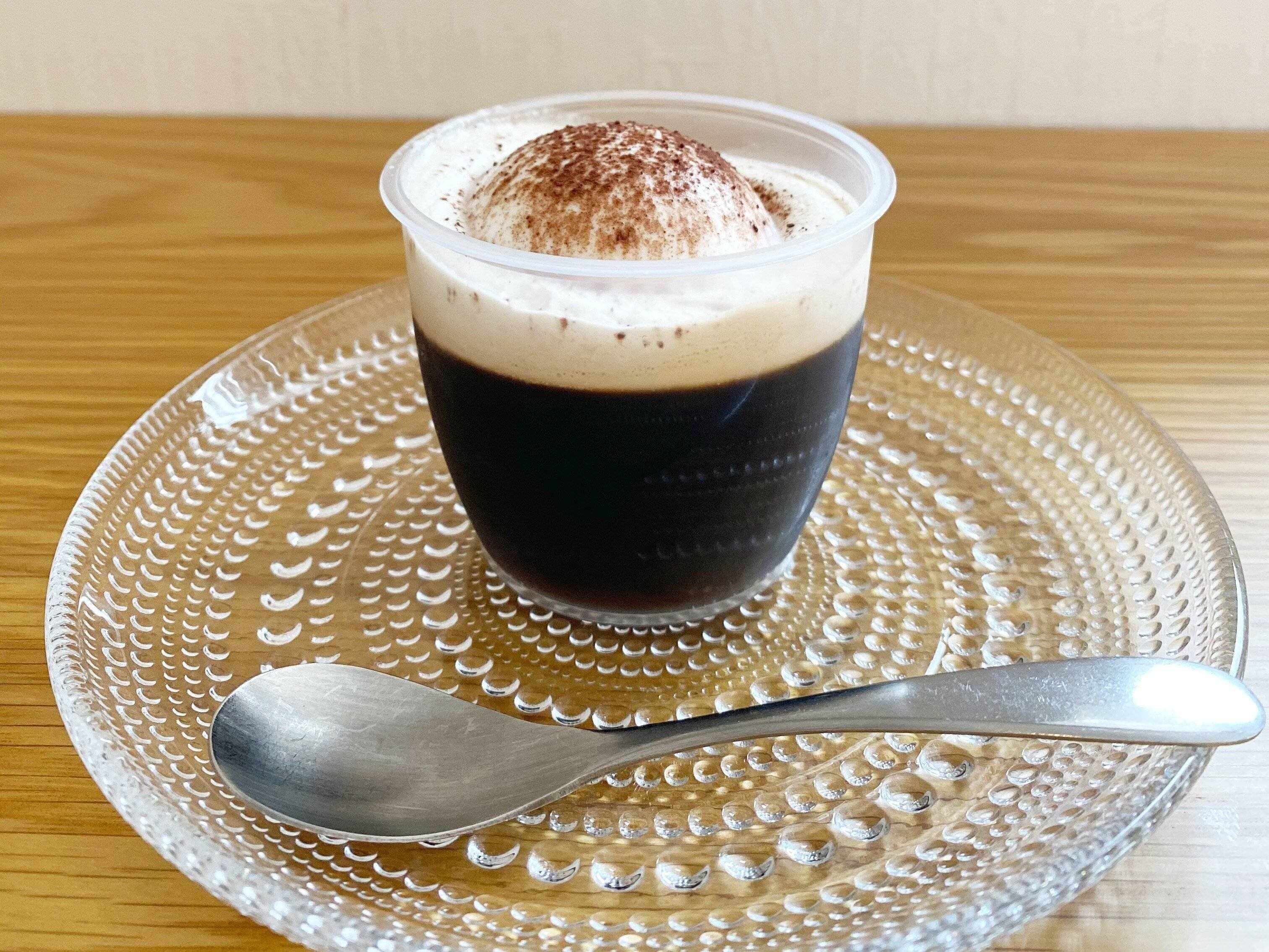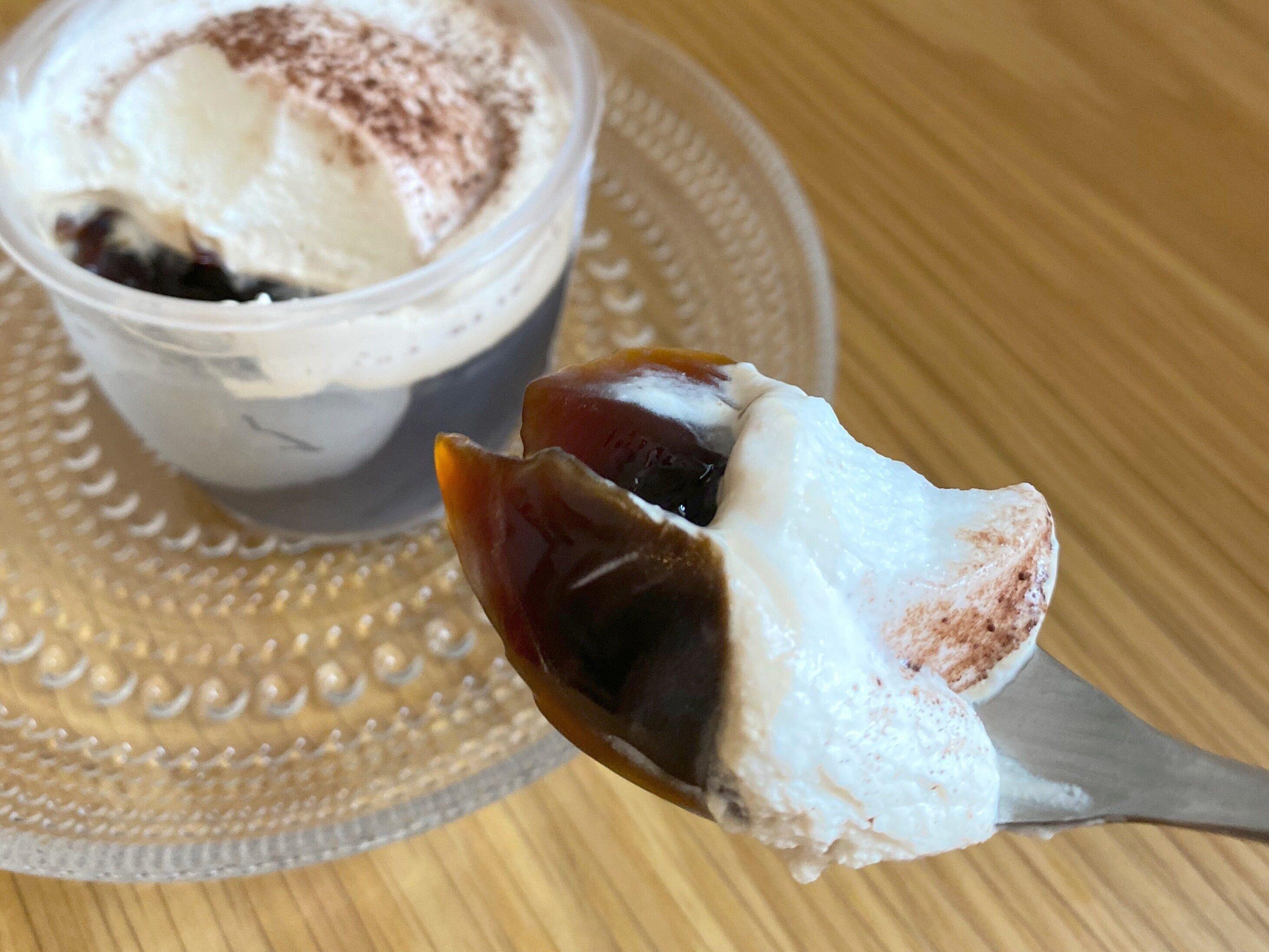 下層からコーヒーゼリー、クリーム、練乳入りムース、ココアパウダーとなっています。