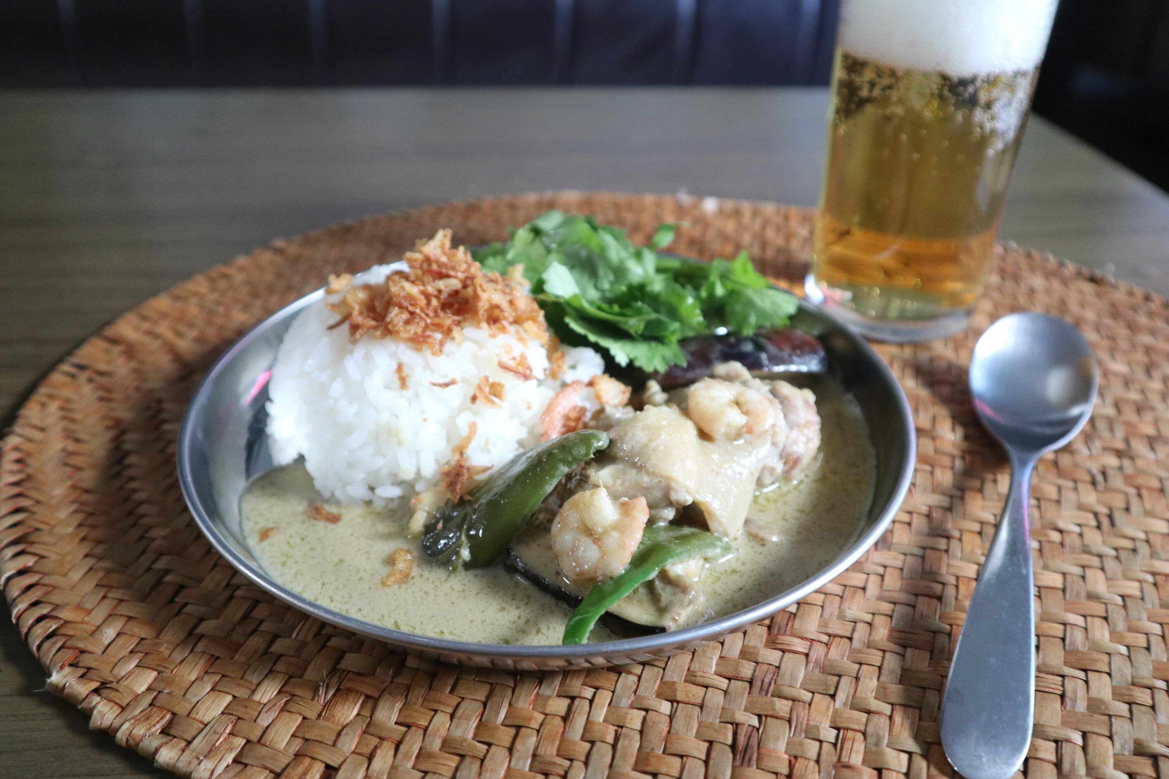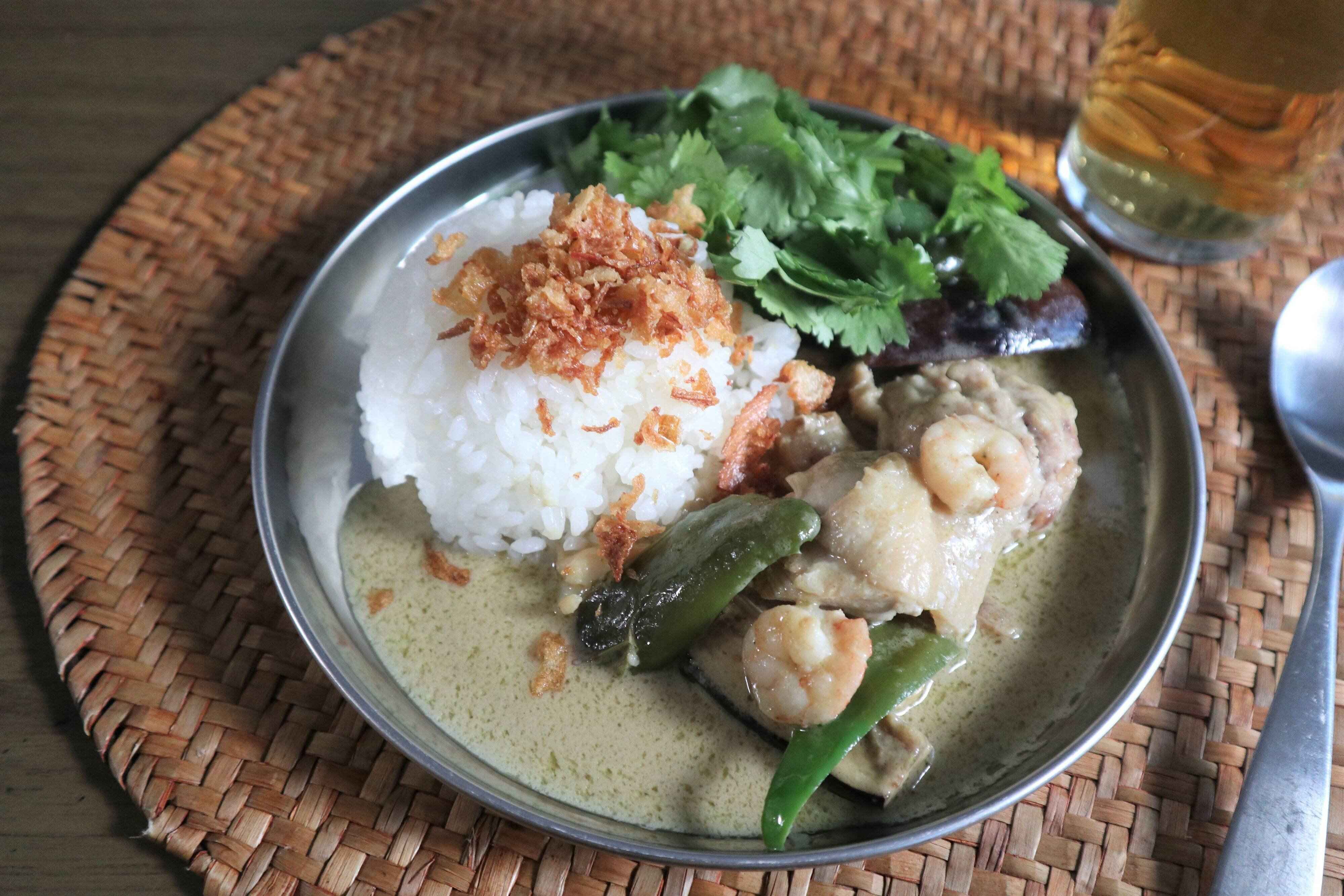 器にごはん、グリーンカレーを盛り、パクチーとオニオンフライをトッピングしたら完成です。