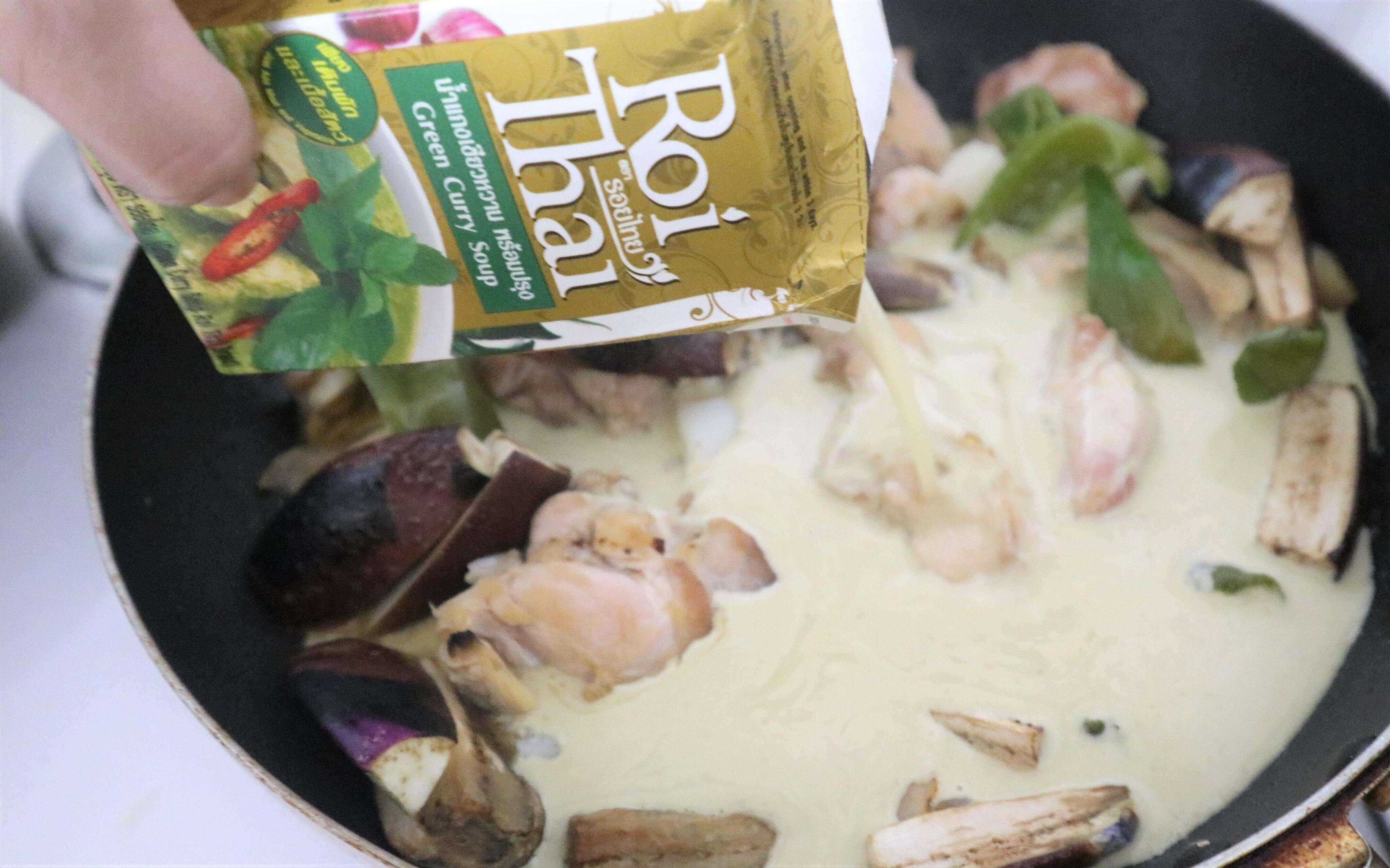 ナスがしんなりとしたらグリーンカレーを加えて、ひと煮立ちさせる。