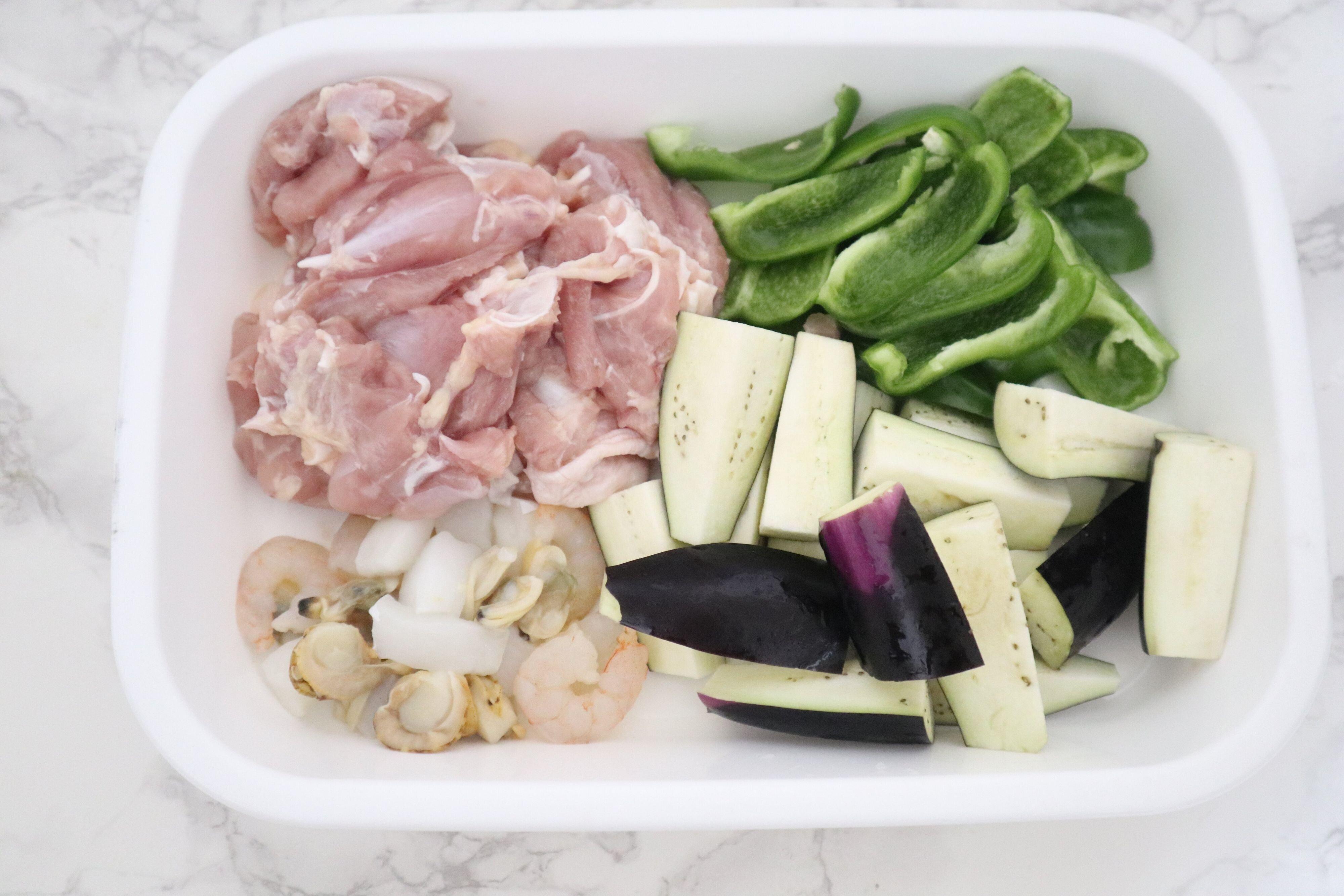 鶏もも肉、ナス、ピーマンは一口大に切る。