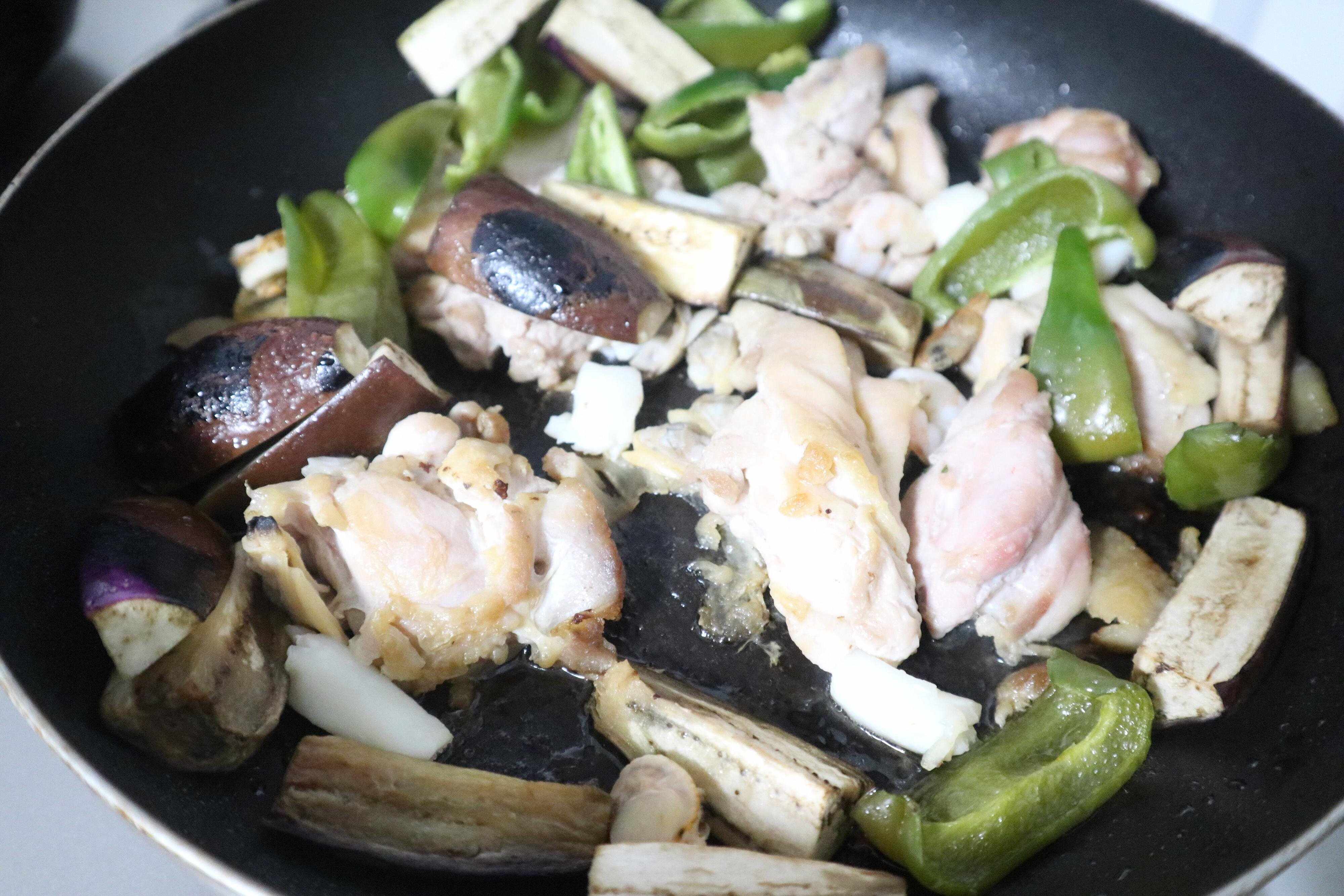 中火にかけたフライパンにオリーブオイル大さじ1を入れて、鶏肉を加えて焼く。鶏肉の両面がこんがり焼けたら、ナスとピーマンを入れて炒める。