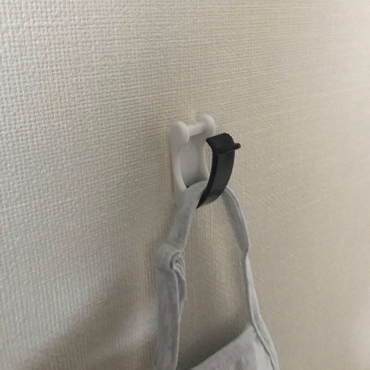 わが家では壁にマスクをひっかけておくのに使っています。フックを止めてしまえば落ちる心配がありません。壁に貼る場合は、マスキングテープの上から貼っています。軽いものだと落ちたりしませんよ。