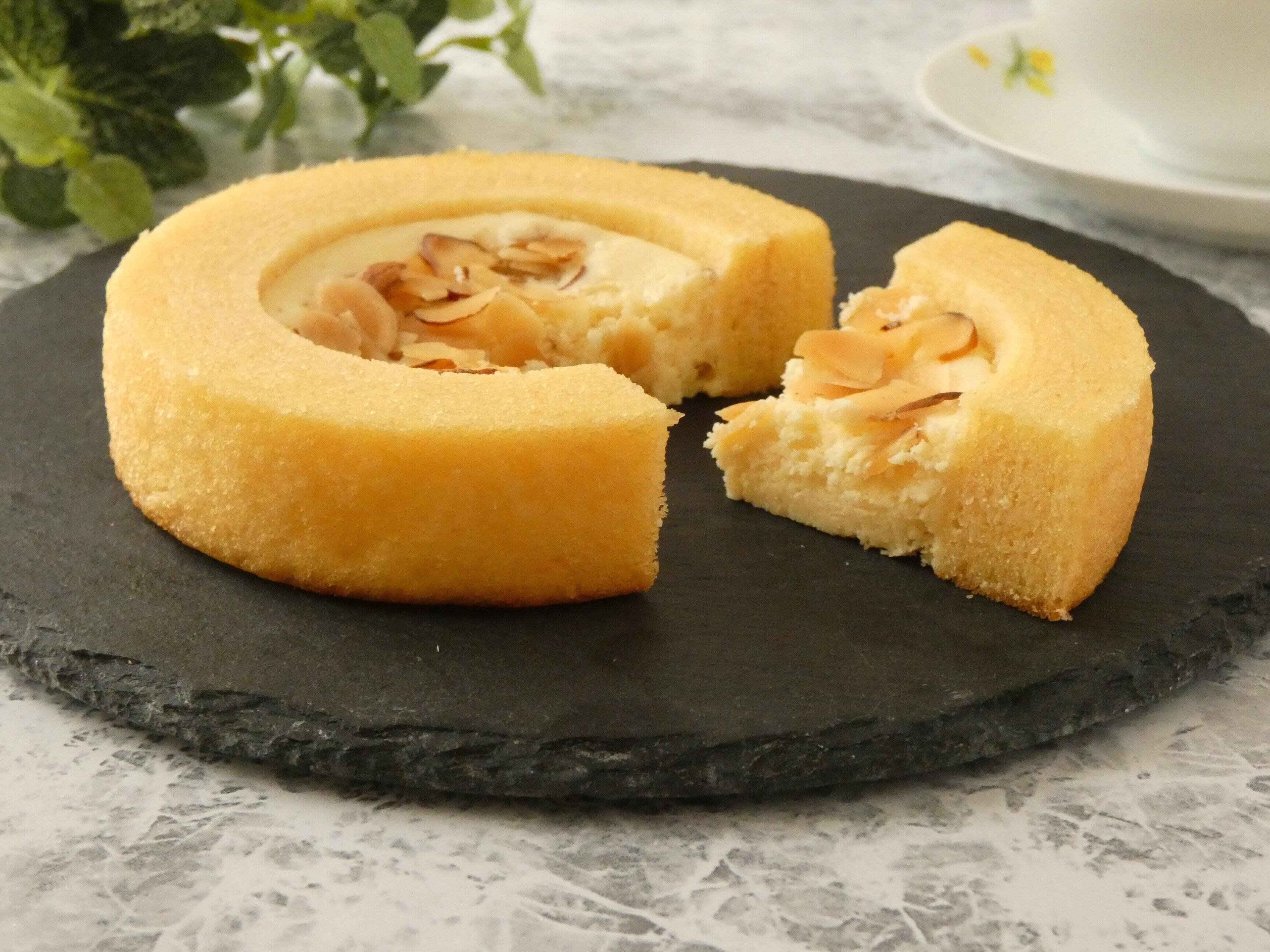 2㎝ほどの厚さのバウム中央にチーズケーキがたっぷり入っていて、上にはスライスアーモンドがちりばめられています。