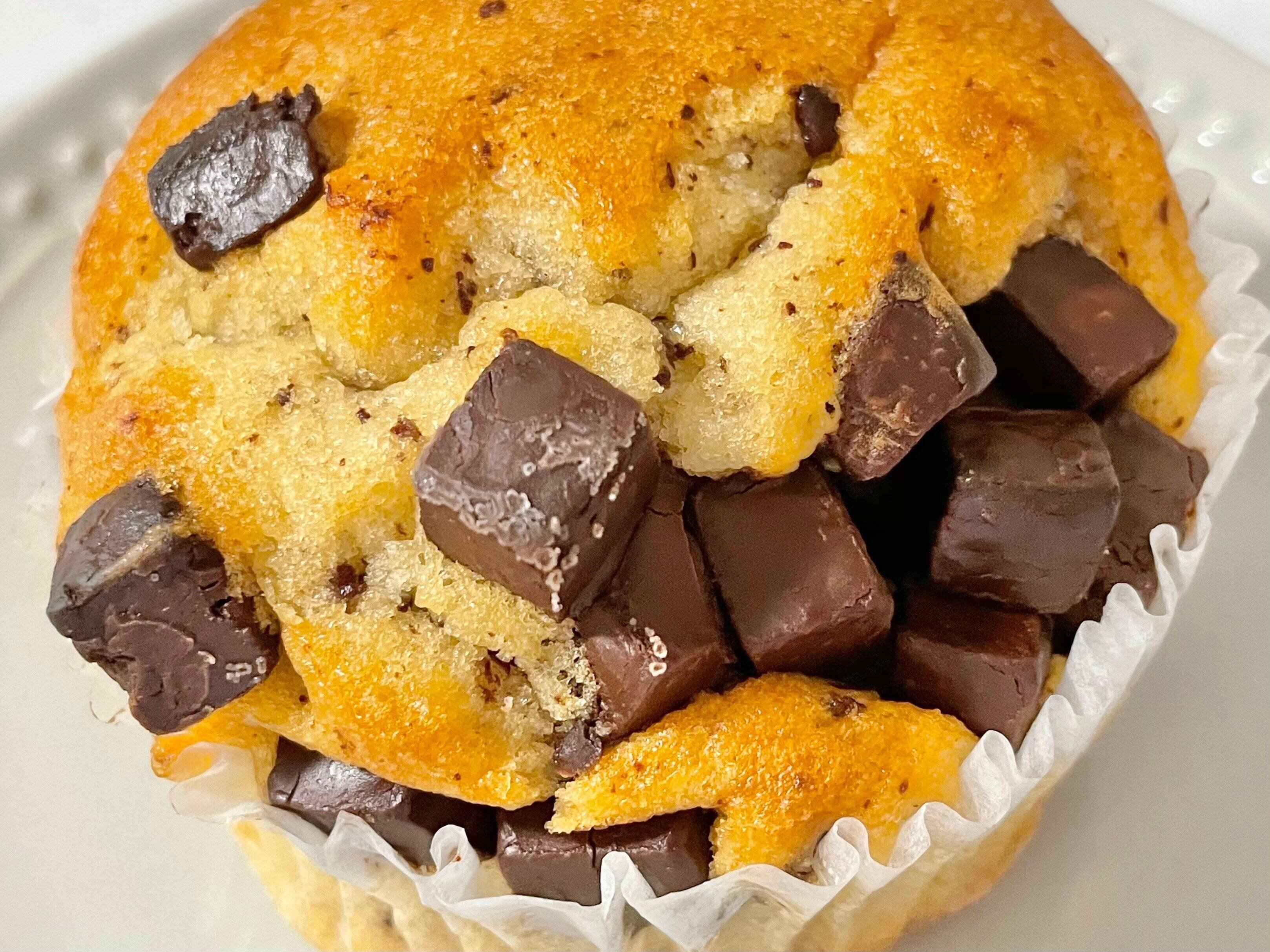 見た目と食感に特徴のあるチョコをトッピングしたチョコマフィンで、サイズは手のひらほど。価格は149円とコンビニベーカリーの中では少々お高いです。