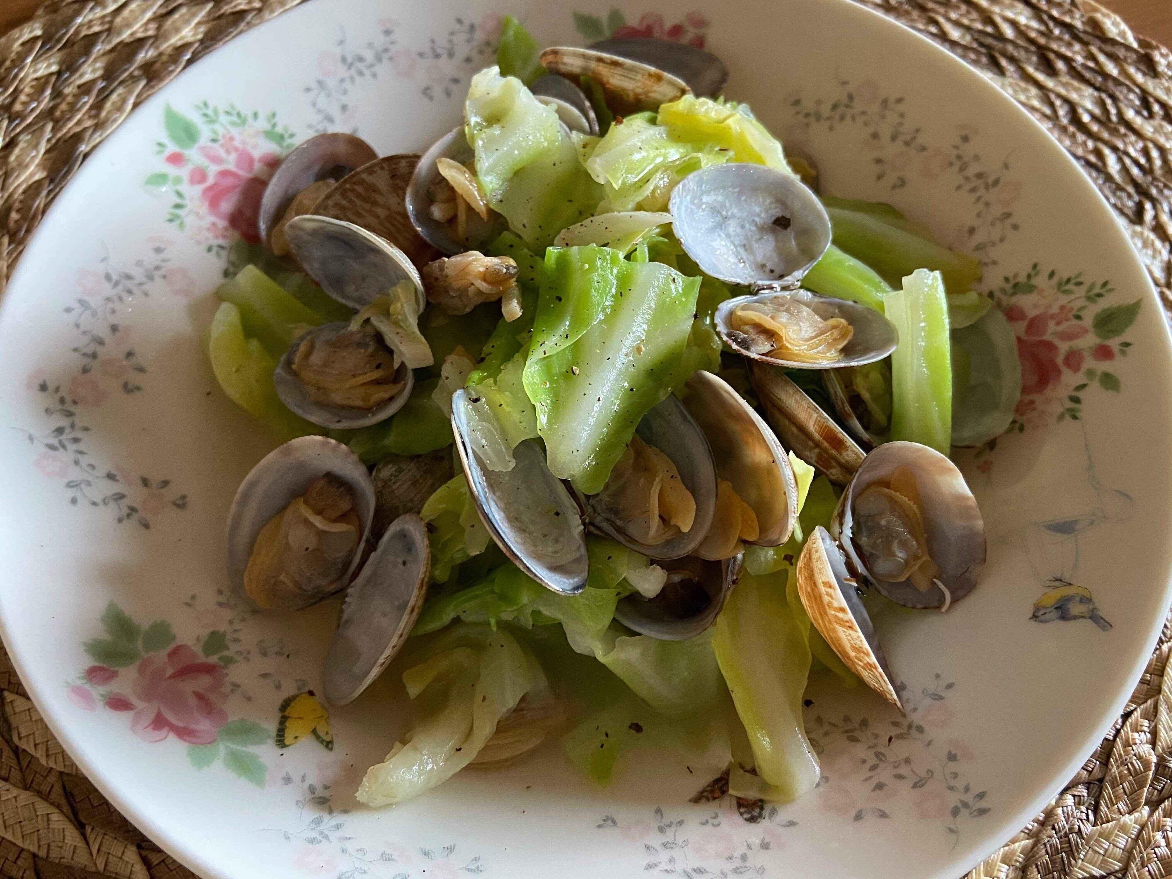 キャベツとにんにくと一緒に酒蒸しに。