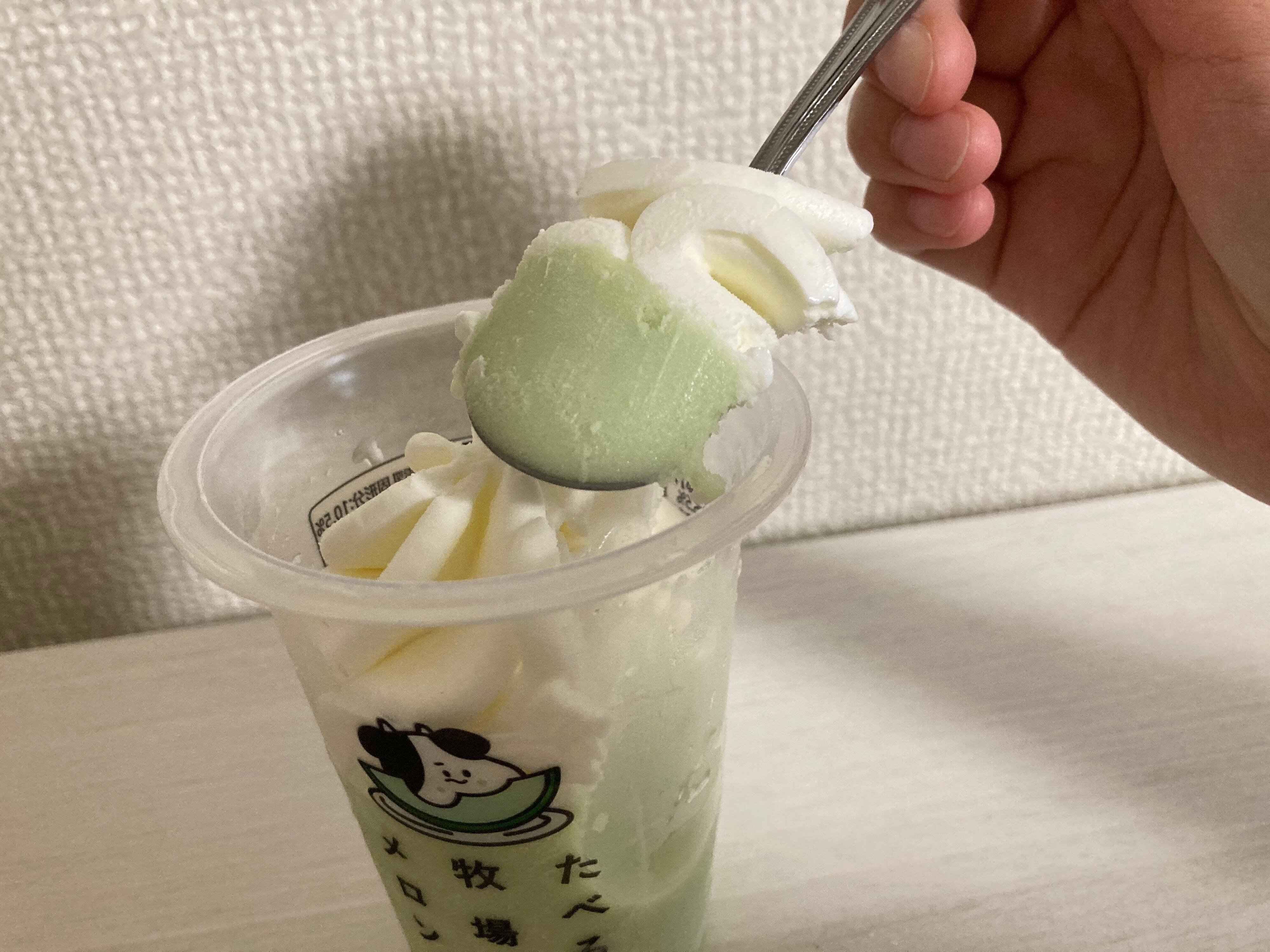 下部のメロンアイスは、思った以上にメロンの味がしっかりと感じられフルーティー。ねっとりとした食感も美味しかったです。