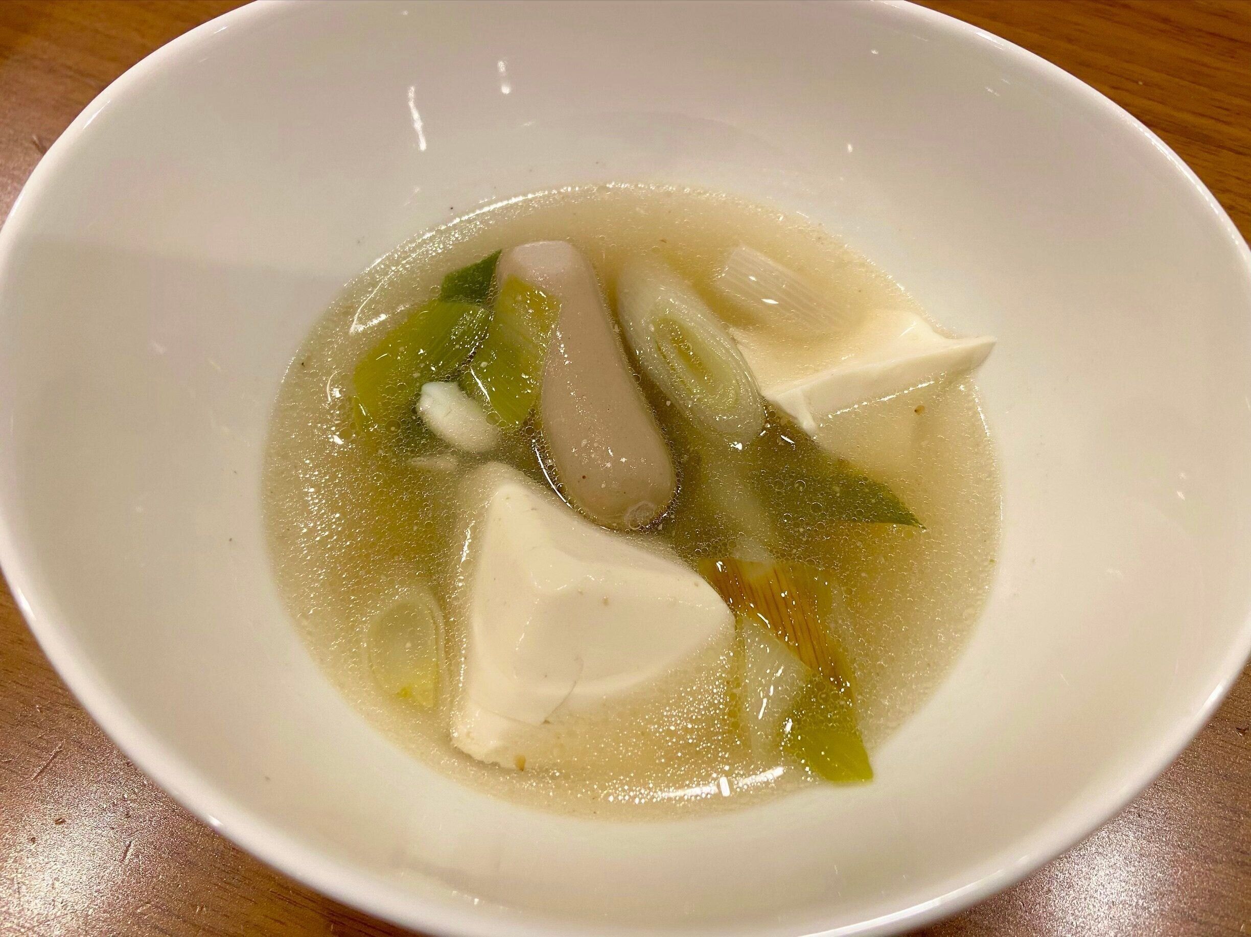写真はネギ、豆腐、ウインナーとシンプルな中華だしのスープです。