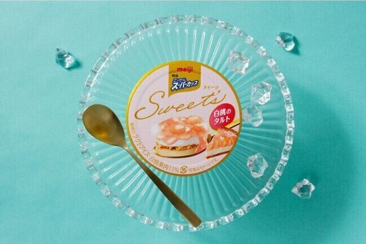「明治 エッセル スーパーカップSweet‘s 白桃のタルト」は、白桃の味わいが凝縮された「白桃果肉入りソース」と、「バニラアイス」「チーズクリーム風アイス」の2種類が織りなす、白桃の旨味を存分に感じる絶妙なマリアージュが美味しさの秘訣です。