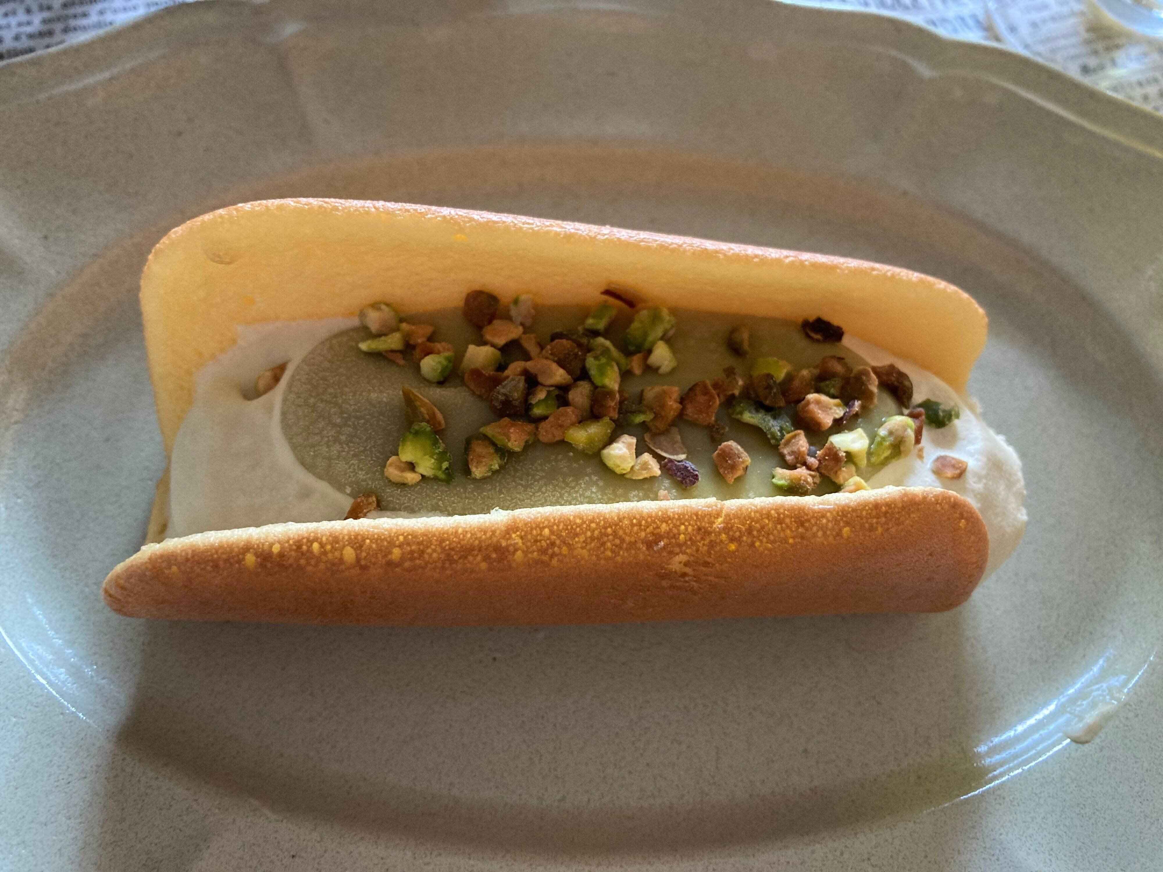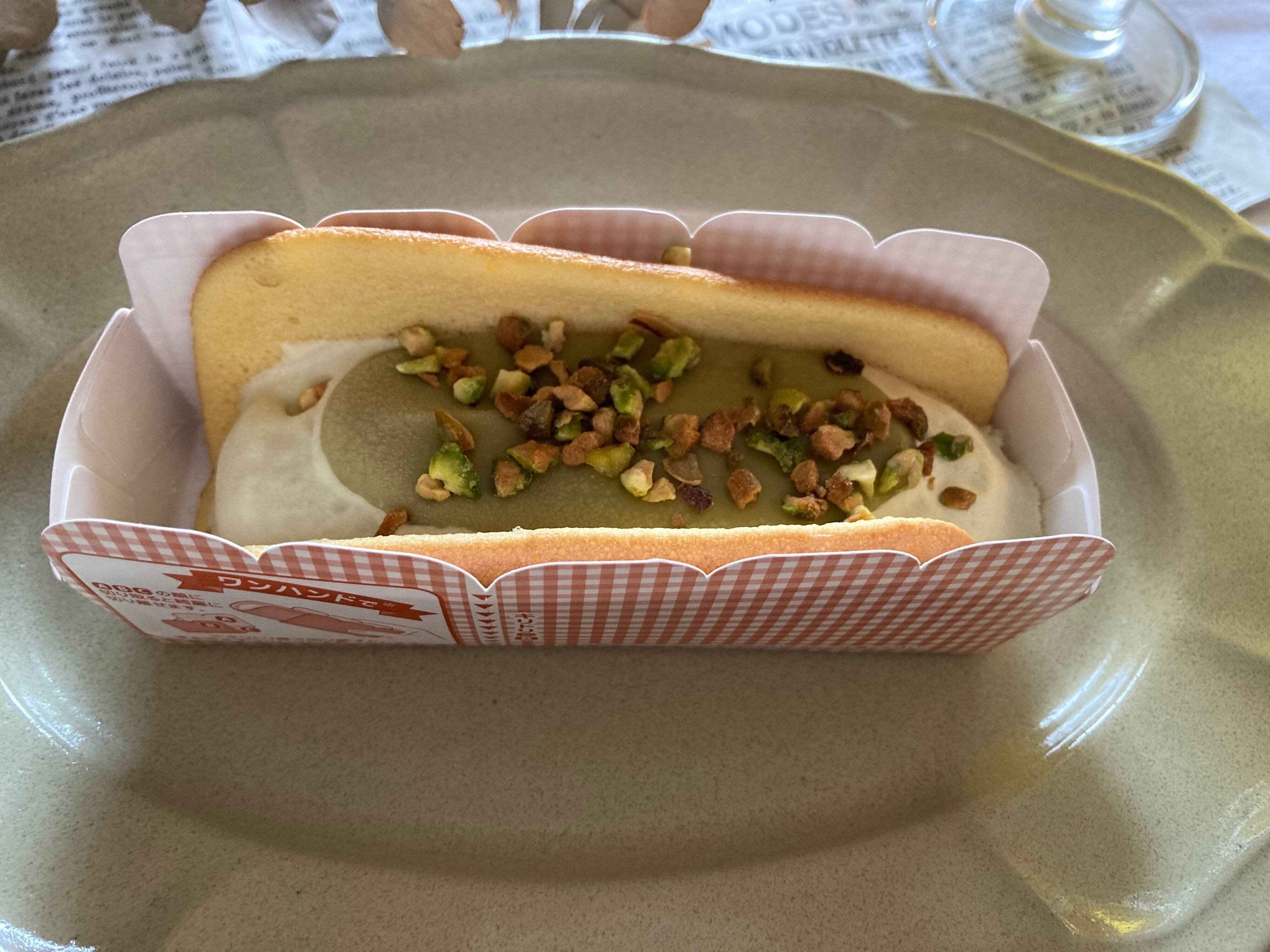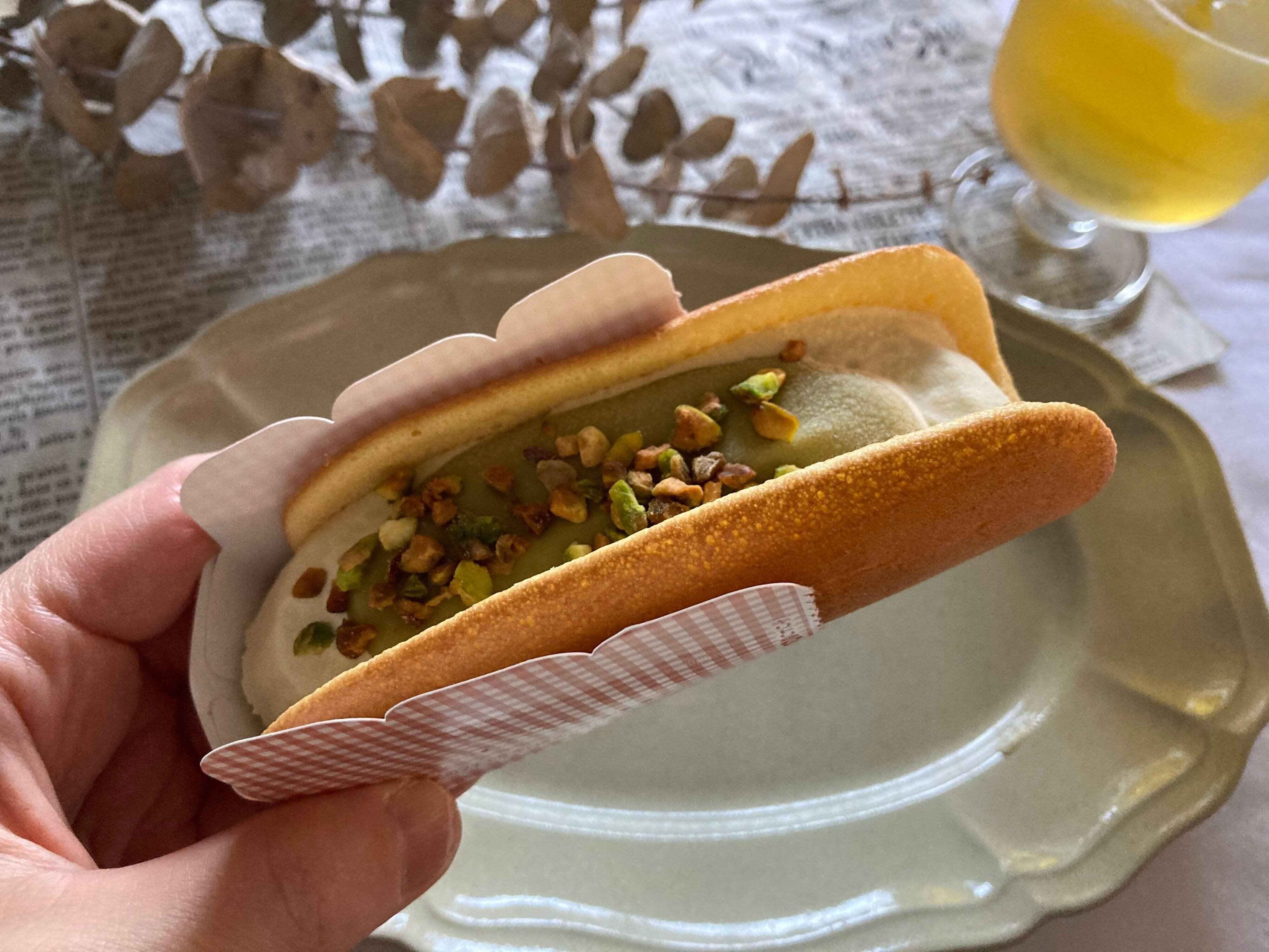 アイス・チョコソース・トッピングにはピスタチオが使われているので、ピスタチオの風味が広がり濃厚で、ふんわり生地との組み合わせも良く、とっても美味しかったです。アイスなのに、まるでケーキを食べているかのような感じでした。