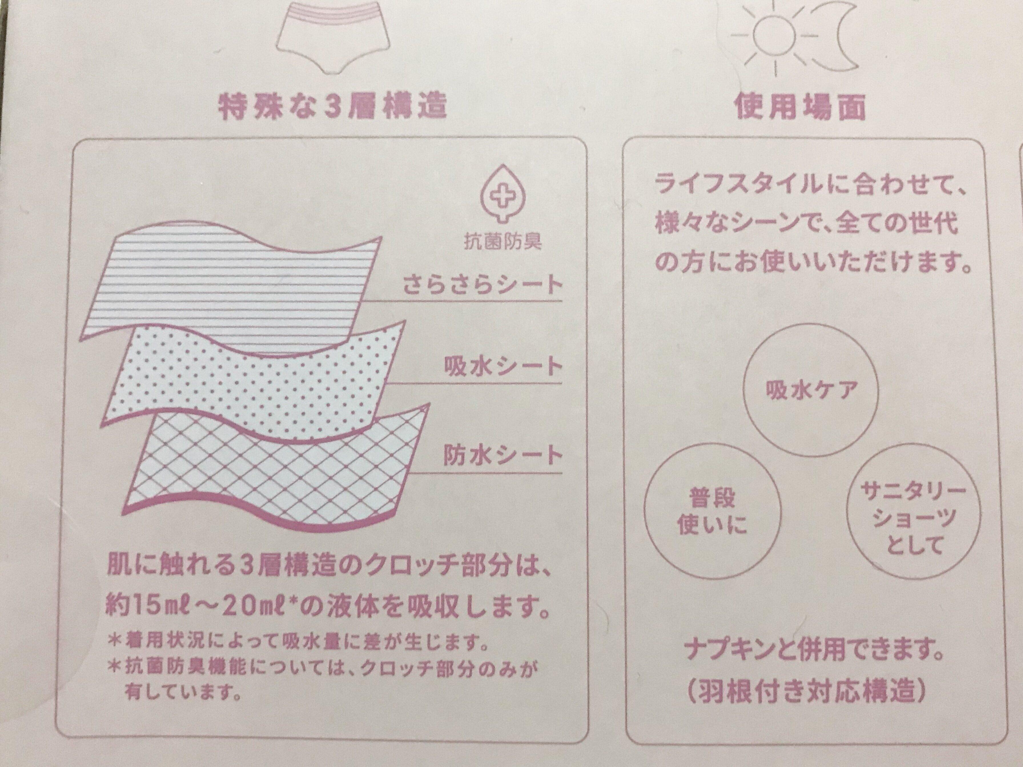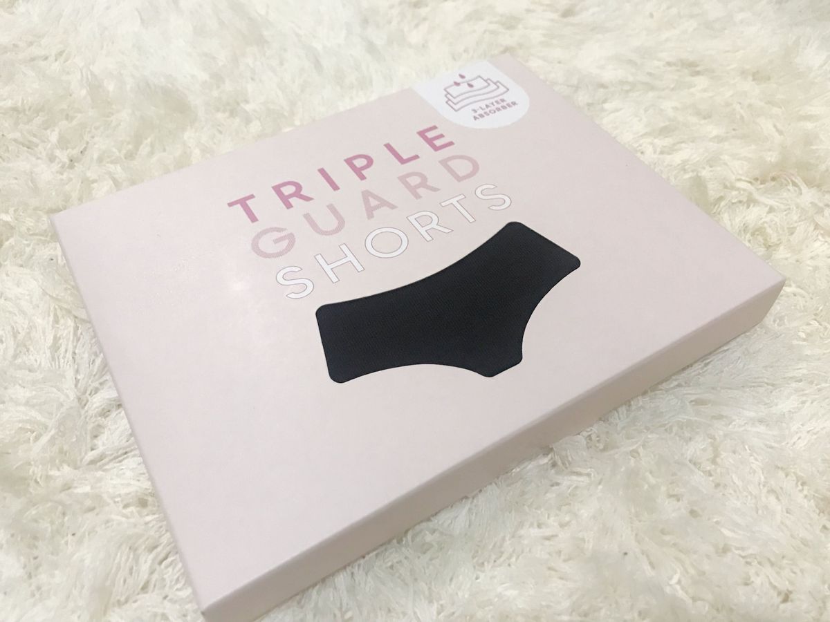 トリプルガードショーツは特殊な3層構造になっていて、肌に触れる部分はさらっとしている吸水シート、真ん中に吸水シート、さらに防水シートで漏れを抑制する構造になっているようです。