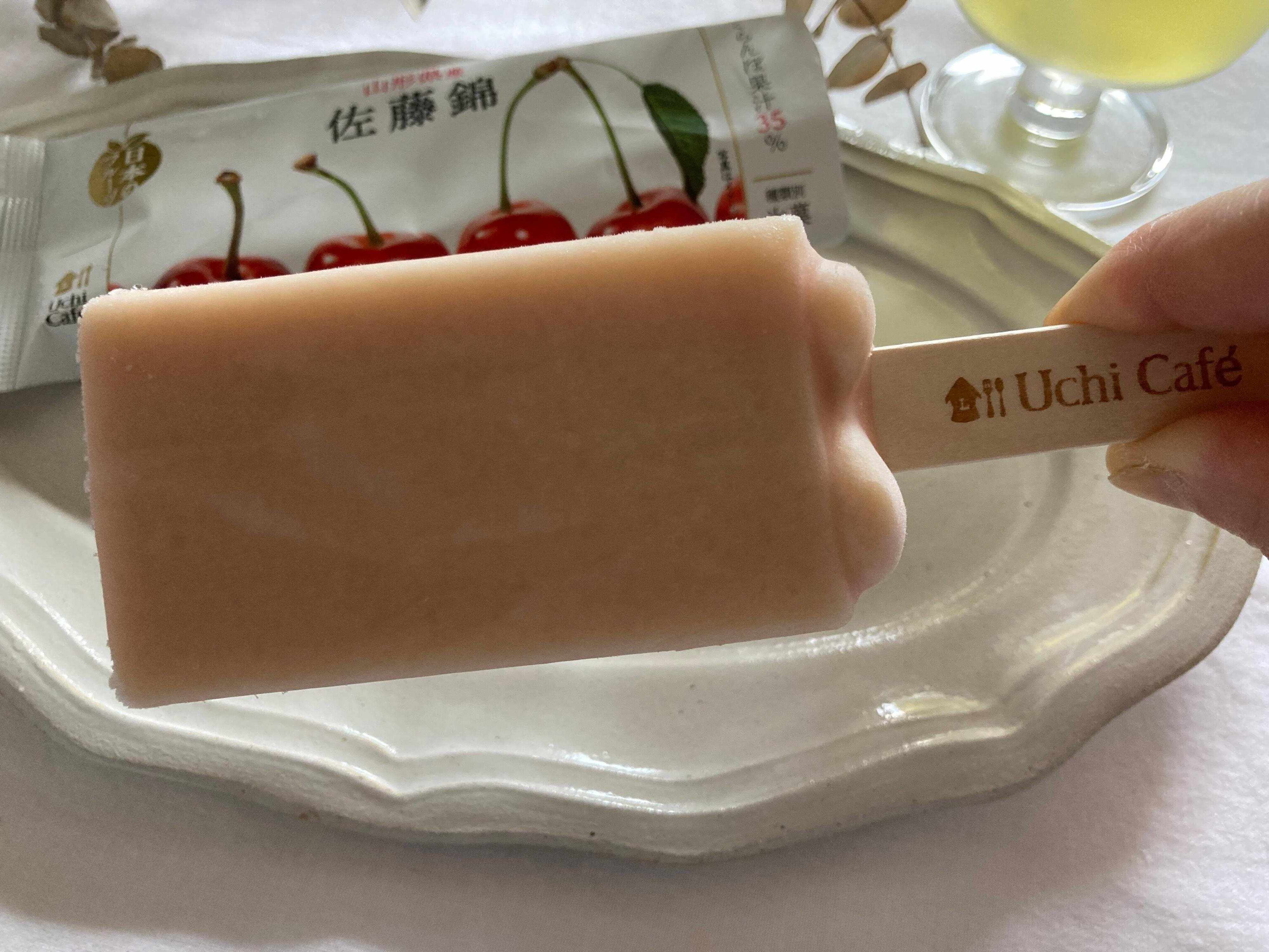 袋を開封すると、かわいいピンク色のアイスバーが出てきます。スティックには「Uchi Cafe」ブランドのロゴが焼印で刻まれています。