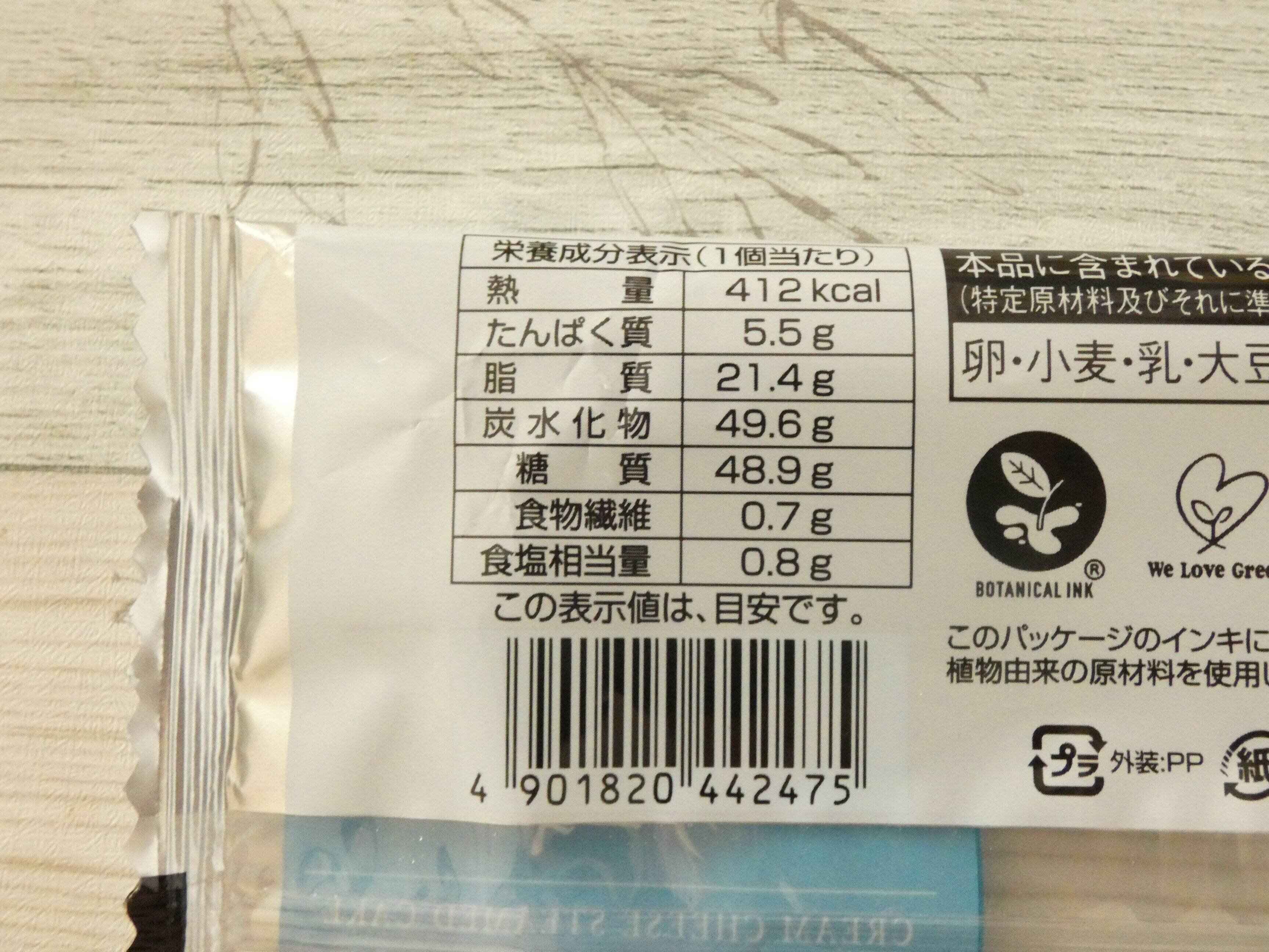 栄養成分表示を見ると1個のエネルギーは412kcal。思っていたよりも高めのカロリーにビックリしました。