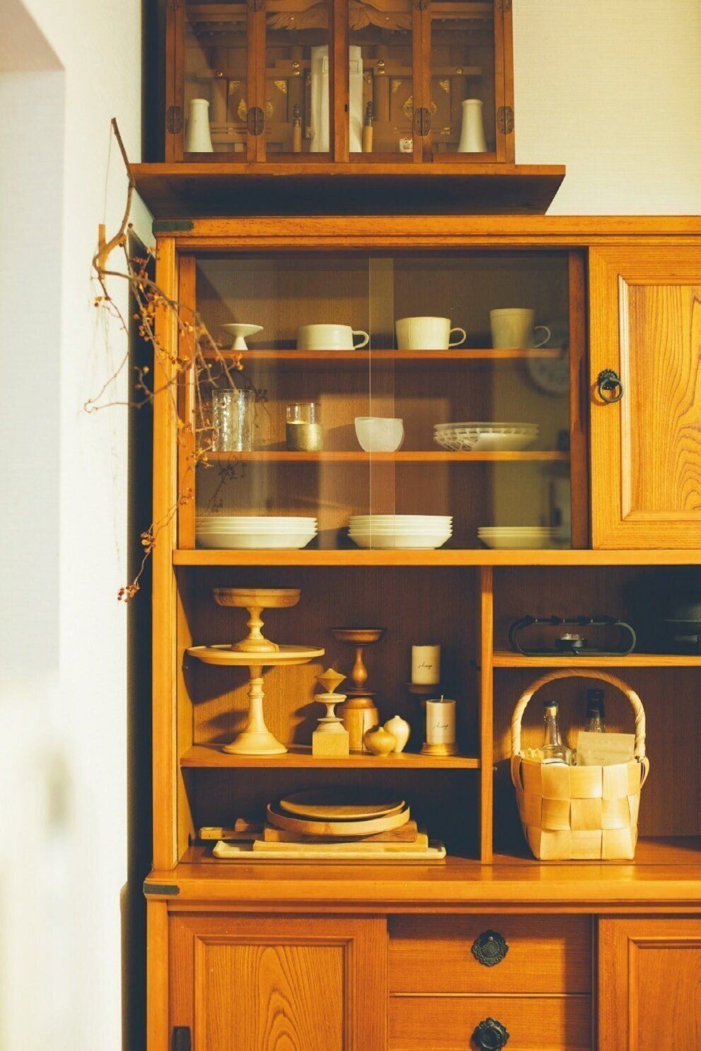 祖母の嫁入り道具だった食器棚を引き継いで大切にしています。撮影用のディスプレイに使う花器はここから。ほかの雑貨は押し入れの箱の中に。