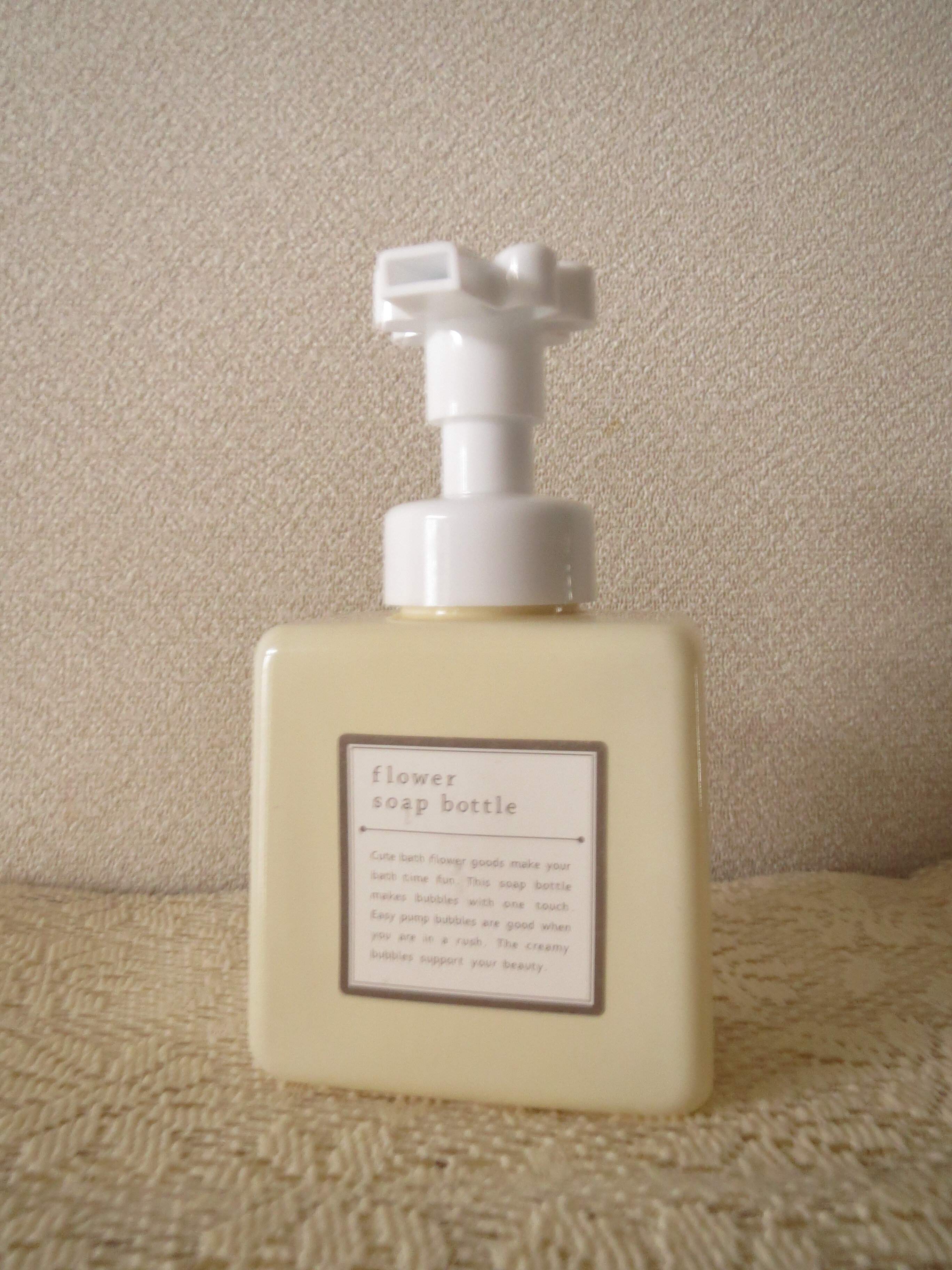 続いてご紹介するのは、プッシュ部分がかわいいお花の形になった「セリア」の「フラワーポンプボトル」です。