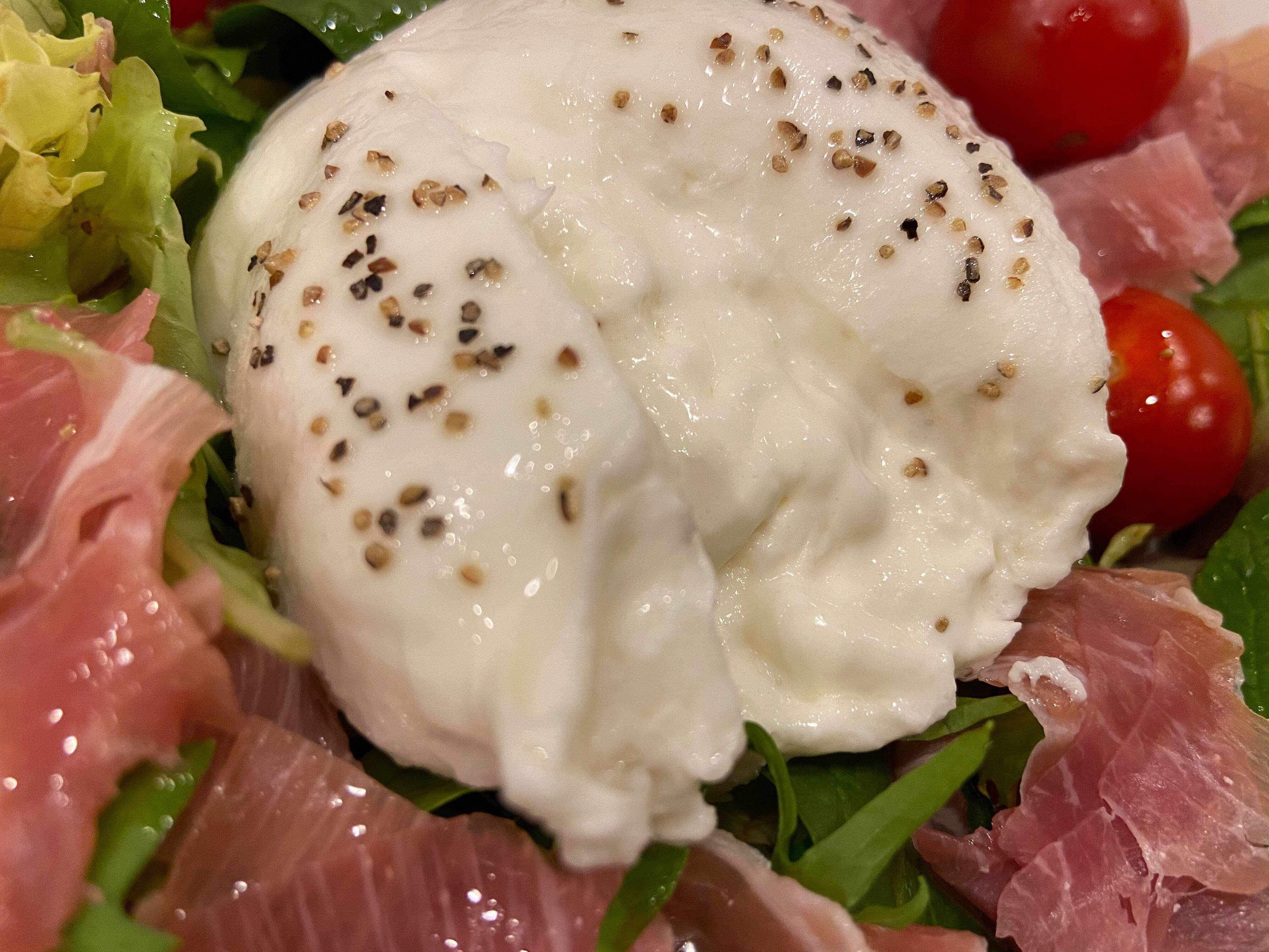 「ブッラータチーズ」とは、モッツァレラチーズで生クリームを包んでつくる超フレッシュなチーズのこと。