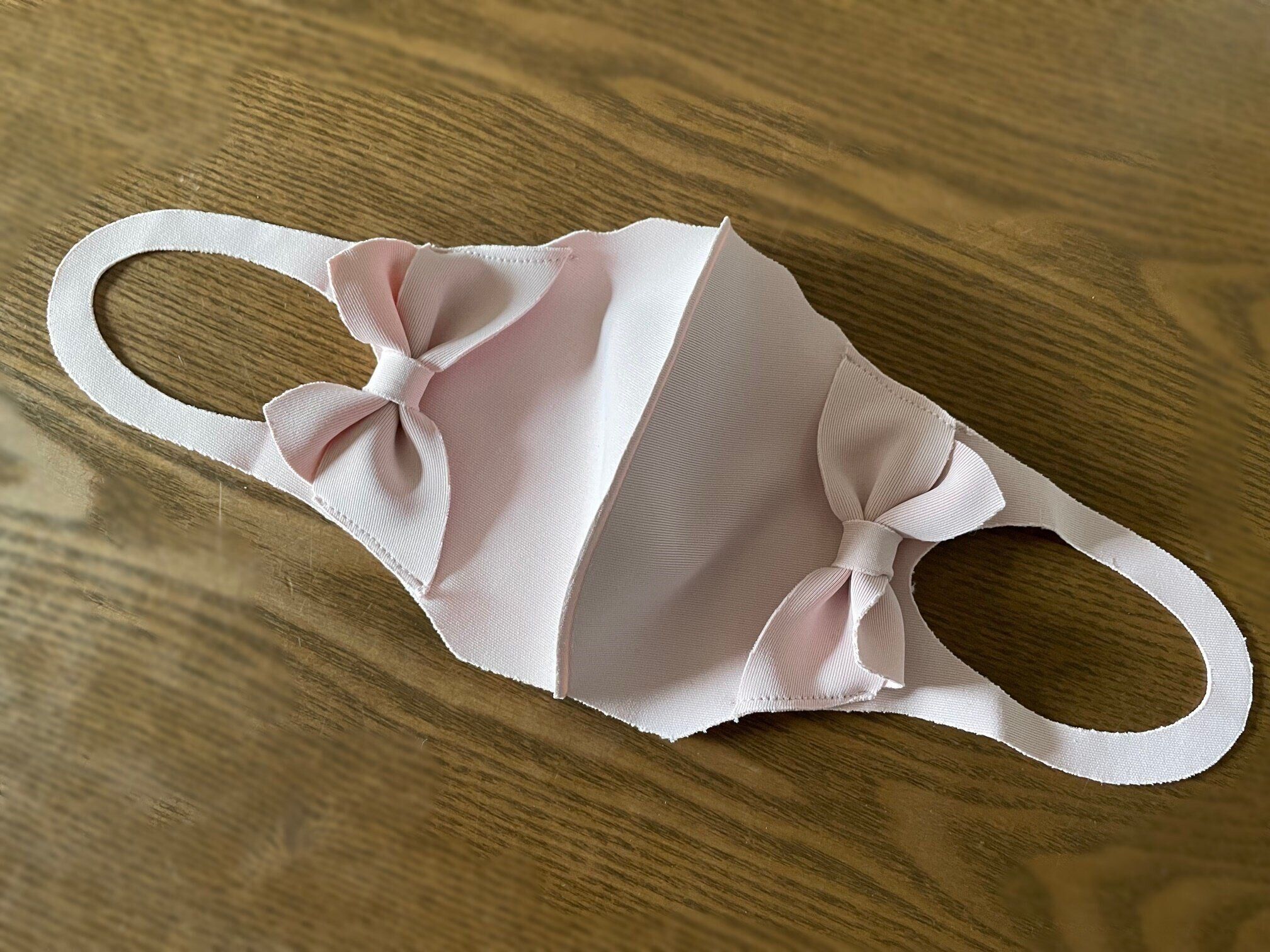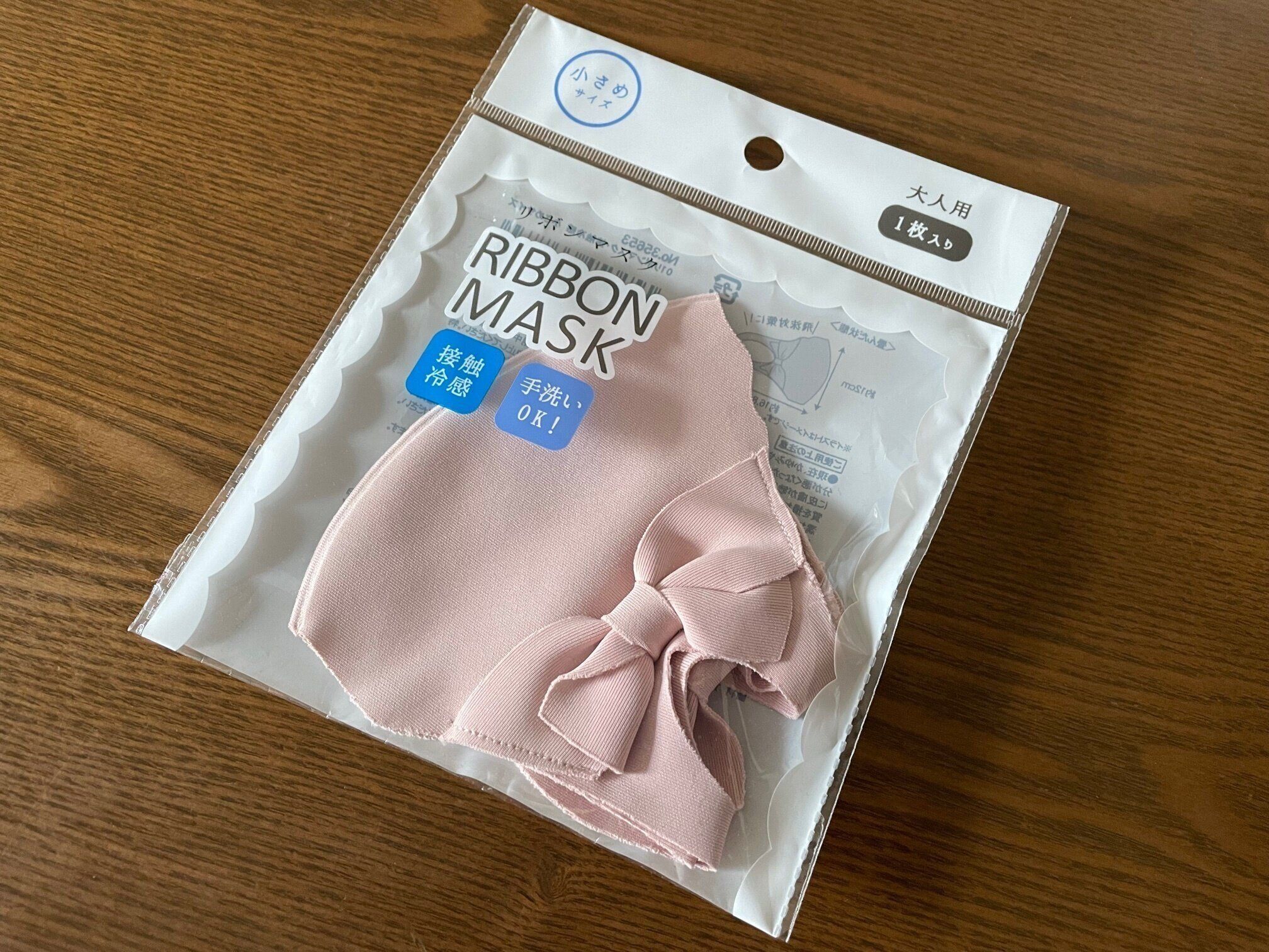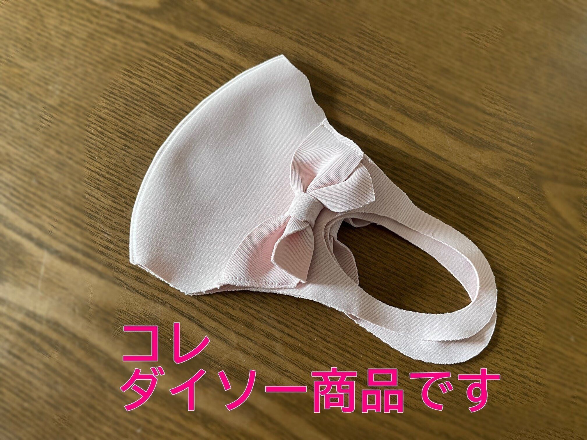 ダイソーのマスク売り場で見つけたのは、接触冷感タイプのリボンマスクです。マスクと同じ生地のリボンが両脇に付いた、ピンク系のかわいいデザイン。