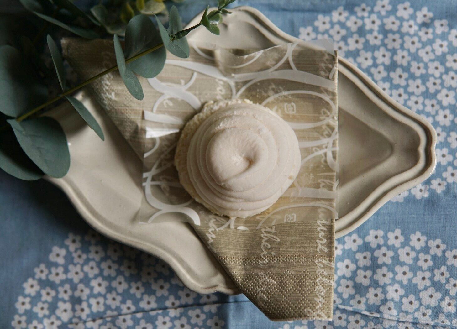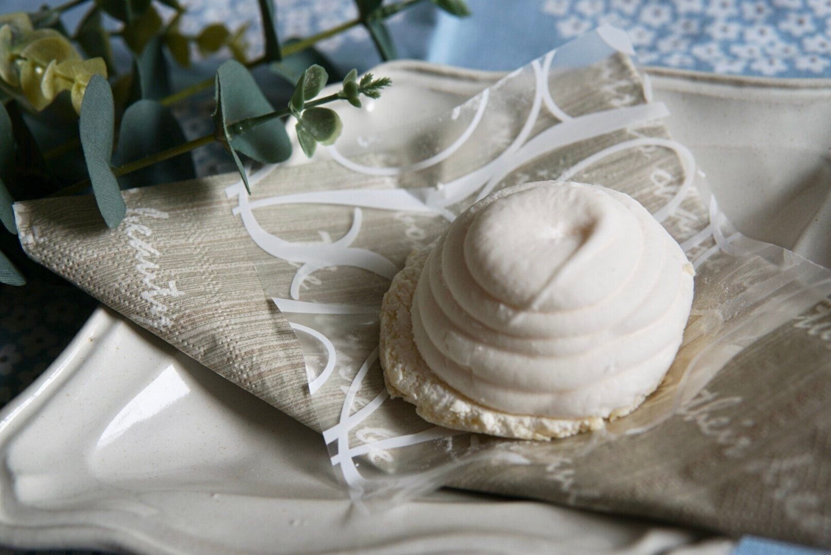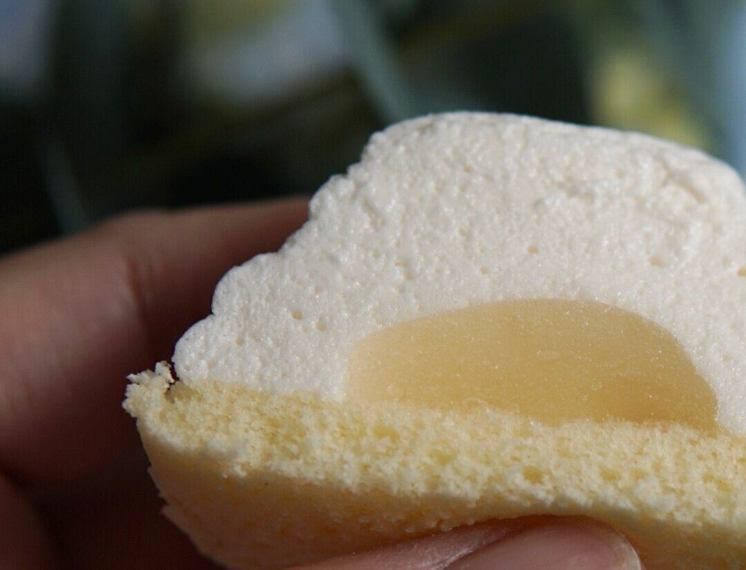 家に帰って、いざ、開封。真っ白で、うずを巻いた、まるえ溶け始めたソフトクリーム風フォルムのマシュマロがスポンジの上に乗っています。