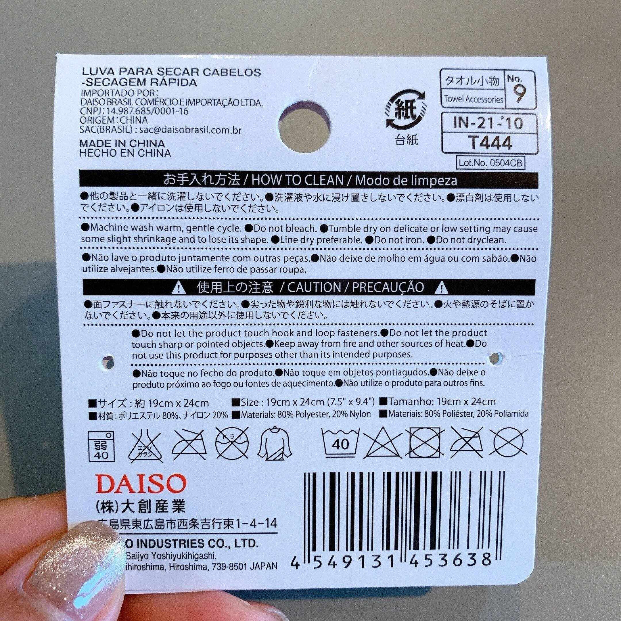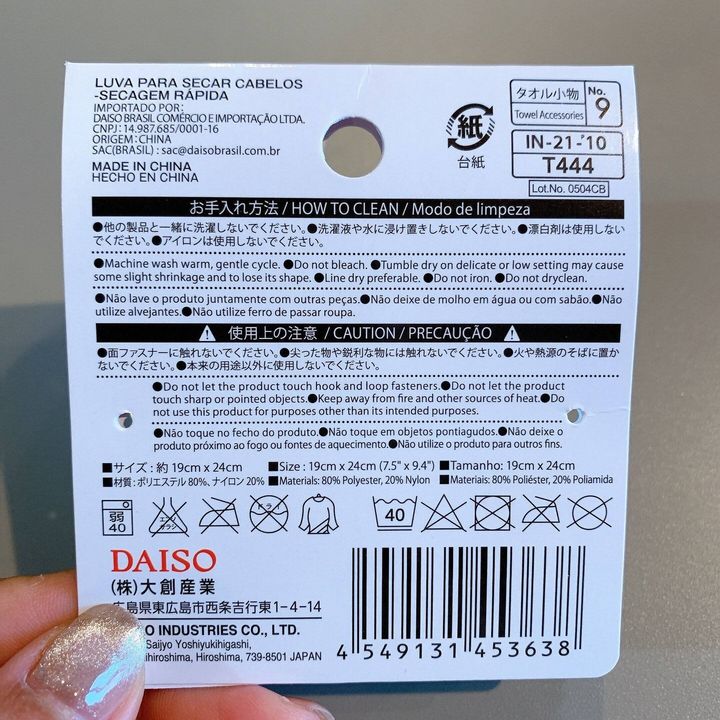 それはダイソーから発売されている、「速乾!ヘアドライ手袋」という名前のアイテムでした。サポートの翌日、早速ダイソーに行き、そのアイテムを購入してみました。