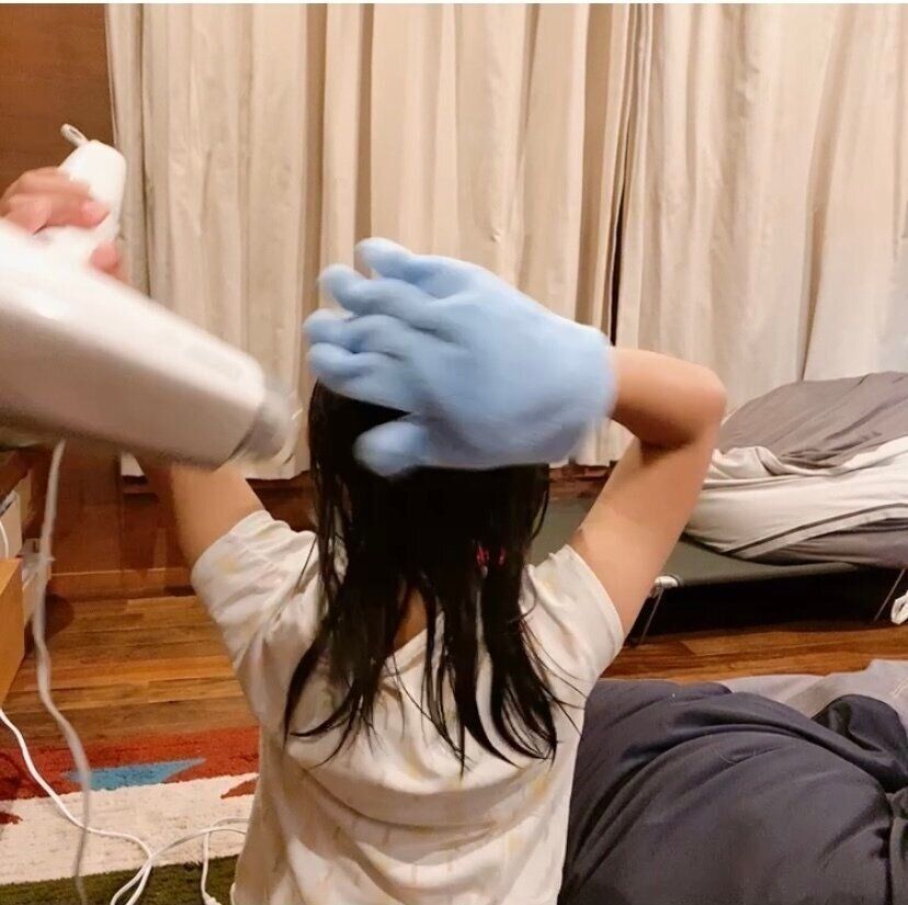 ドライヤーを利き手で持ち、反対の手にこの手袋をはめます。ドライヤーをかけながら、反対の手の手袋で髪を撫でていくだけです。使い方はとてもシンプル、小学校4年生の長女でも簡単にできます。