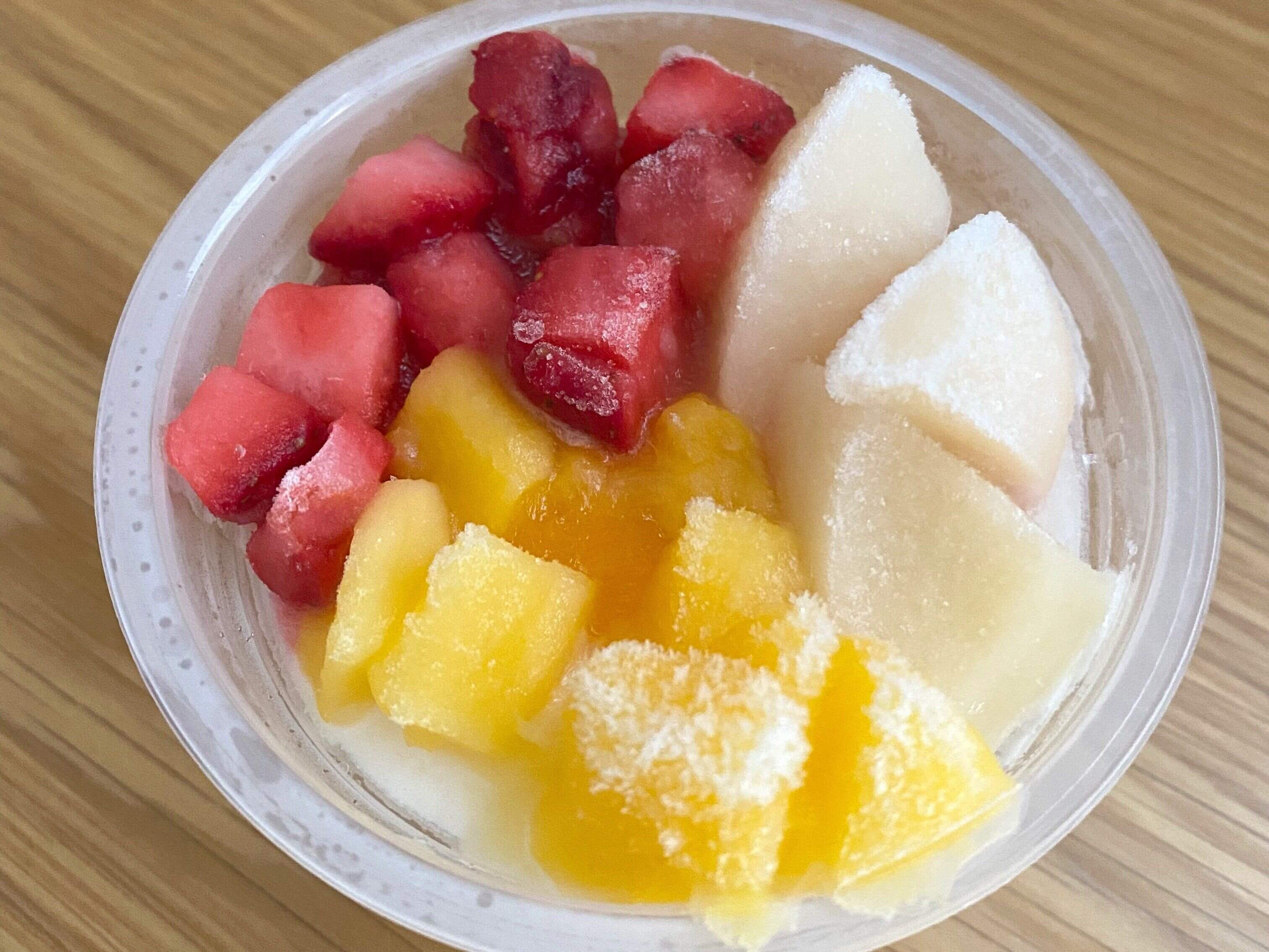 今回新登場した【フルーツ大好きな白くま】は、練乳入りかき氷の上に白桃、いちご、マンゴーの3種類の果肉がトッピングされています。