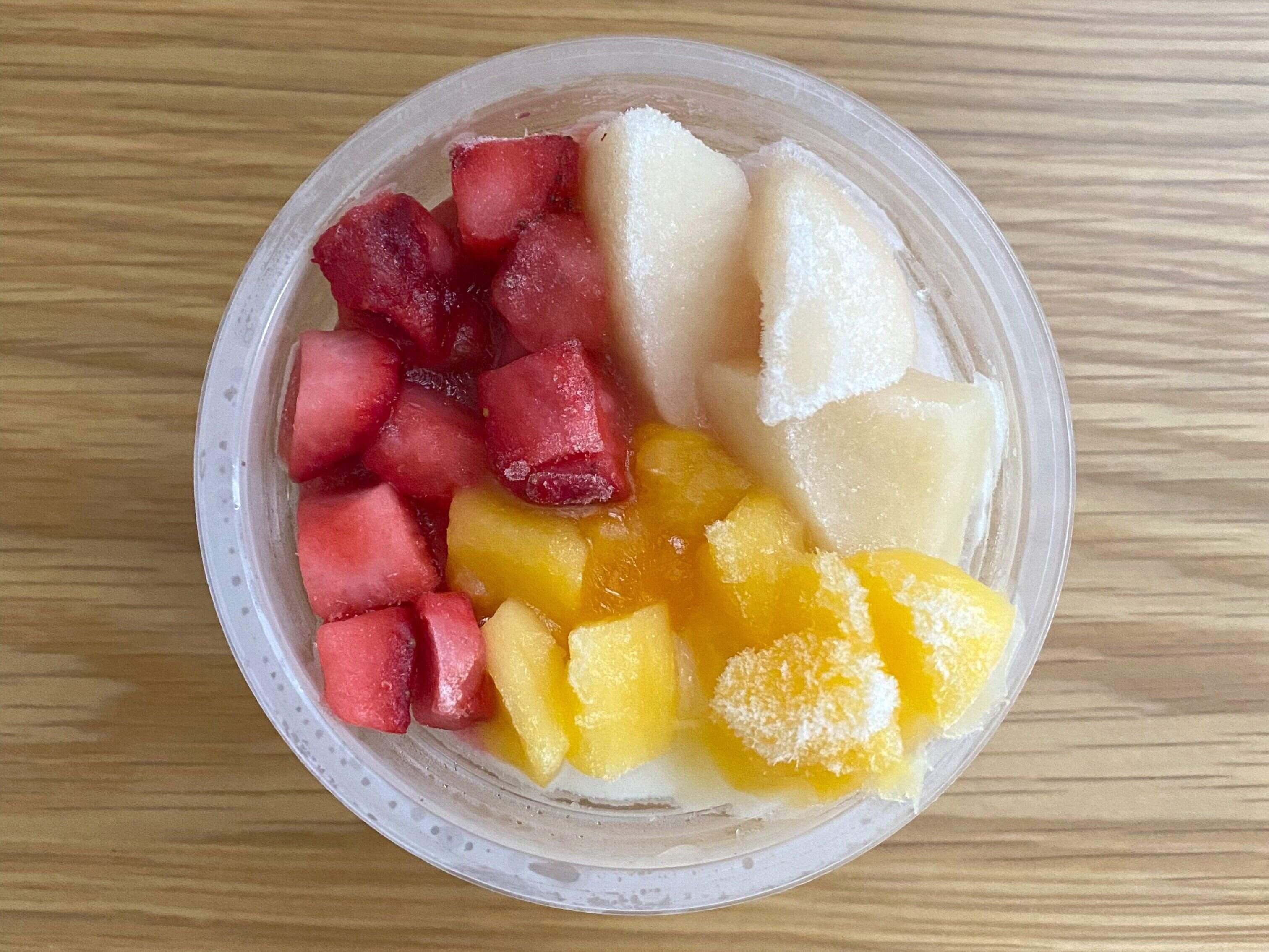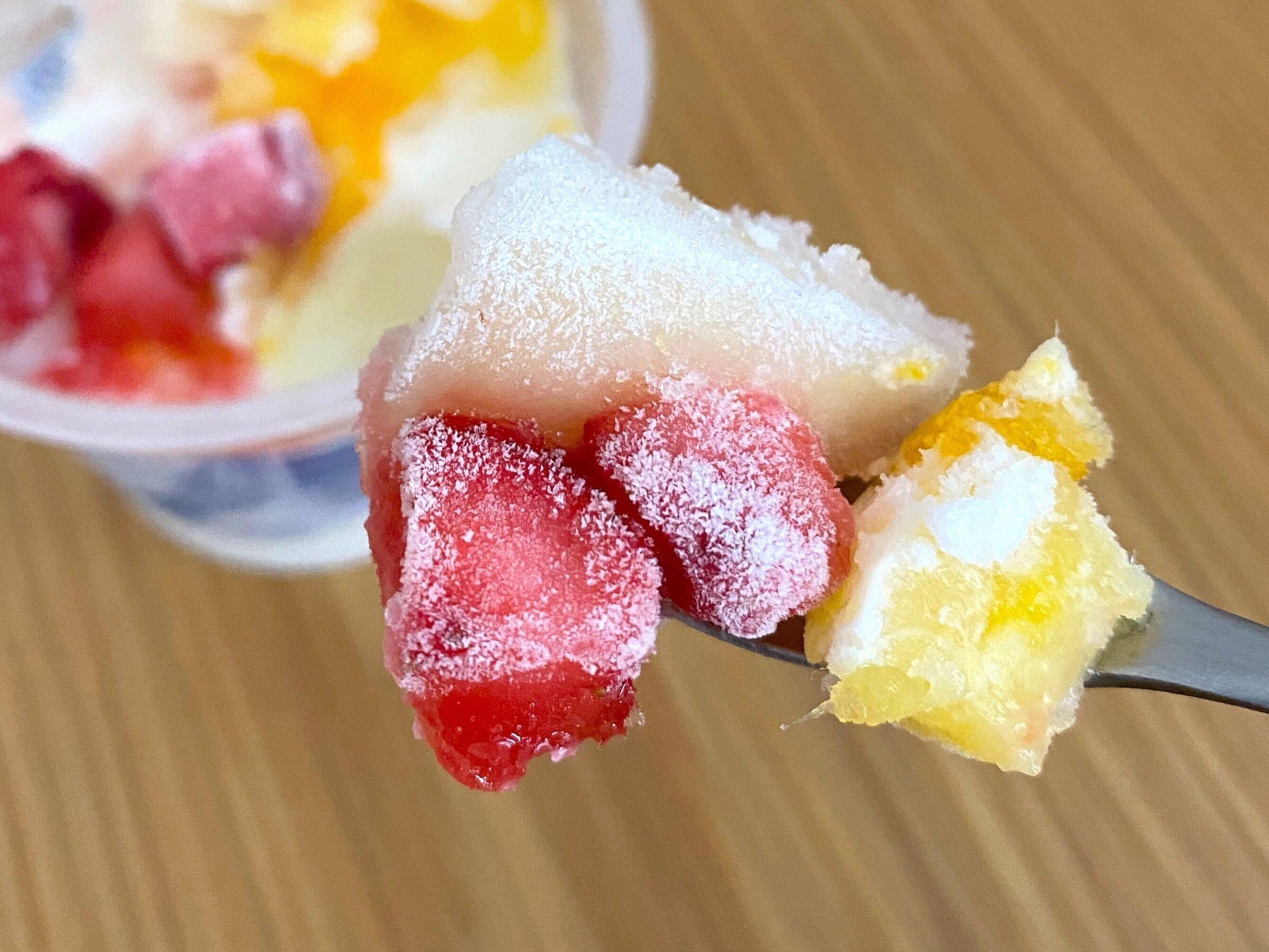フルーツはシャキシャキ食感で味が濃く、それぞれの食感や味の違いを楽しめます。口の中でとけて柔らかくなるとより果実感が増し、フルーツだけでも絶品です!