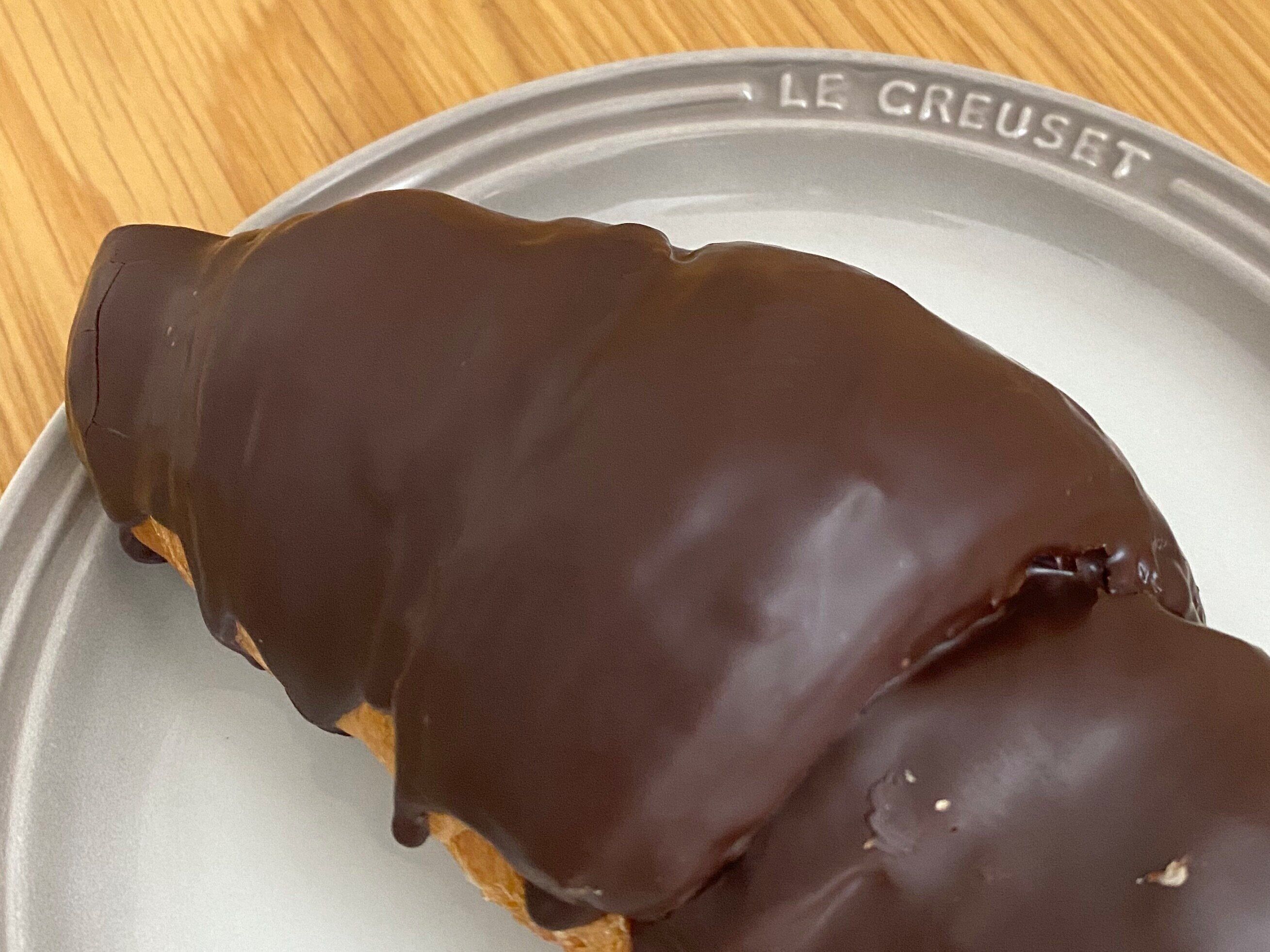 チョコを巻き込んだクロワッサンをチョコレートでコーティングした菓子パン。